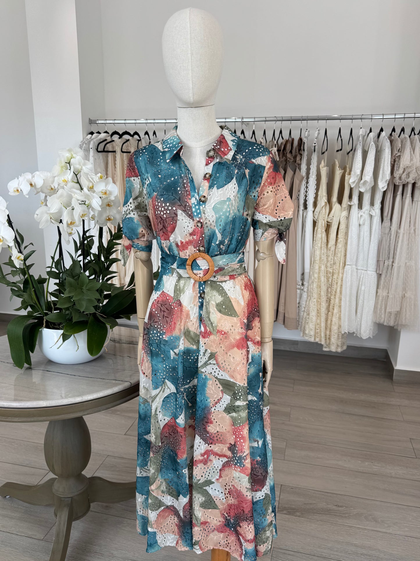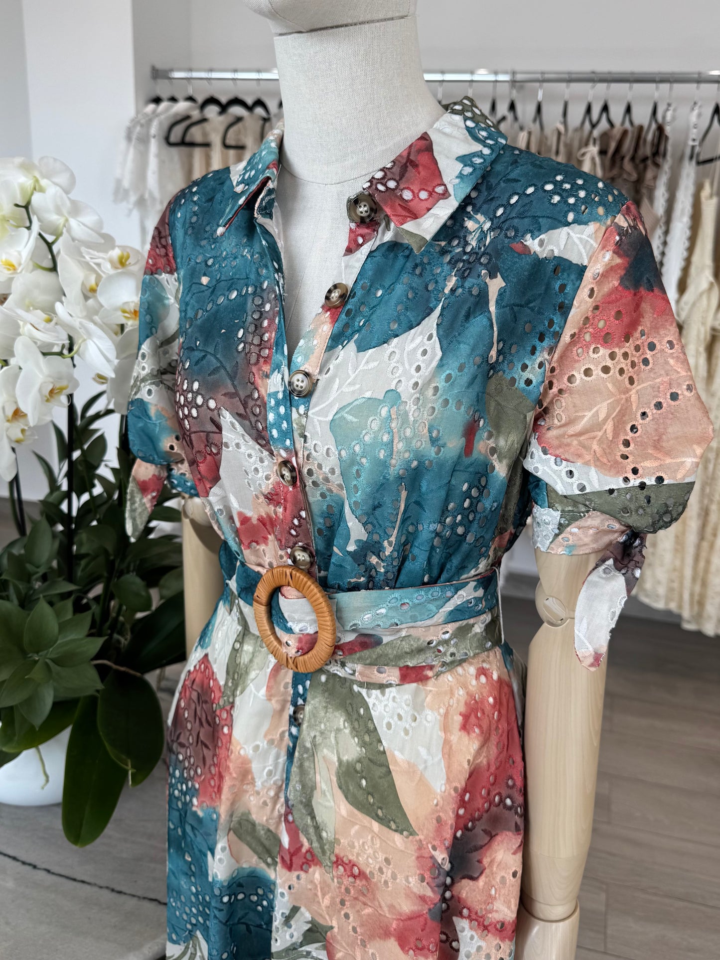 VESTIDO MIDI CAMISERO ALGODÓN BORDADO TROPICAL