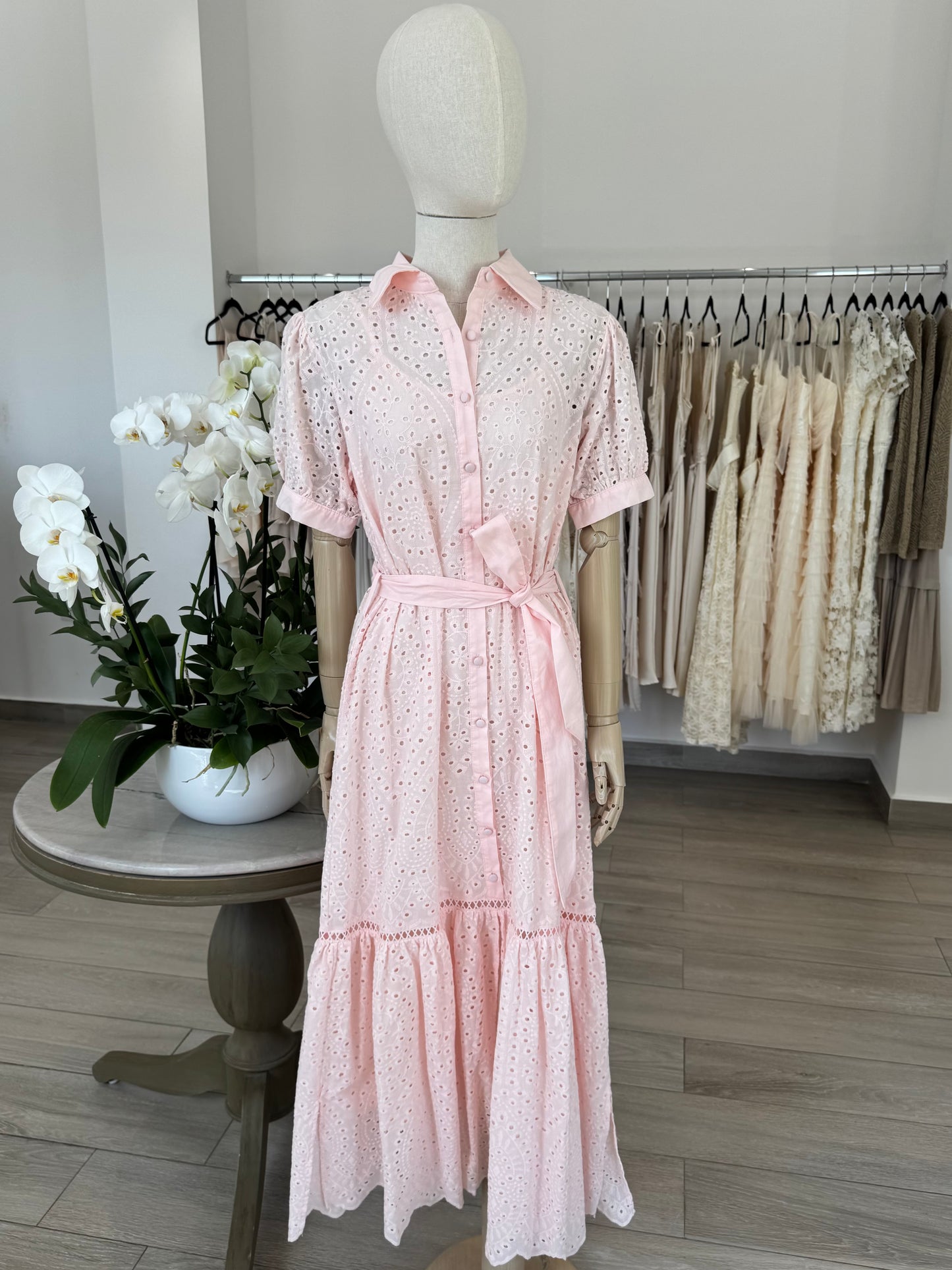 VESTIDO MIDI CAMISERO ALGODÓN BORDADO ROSA