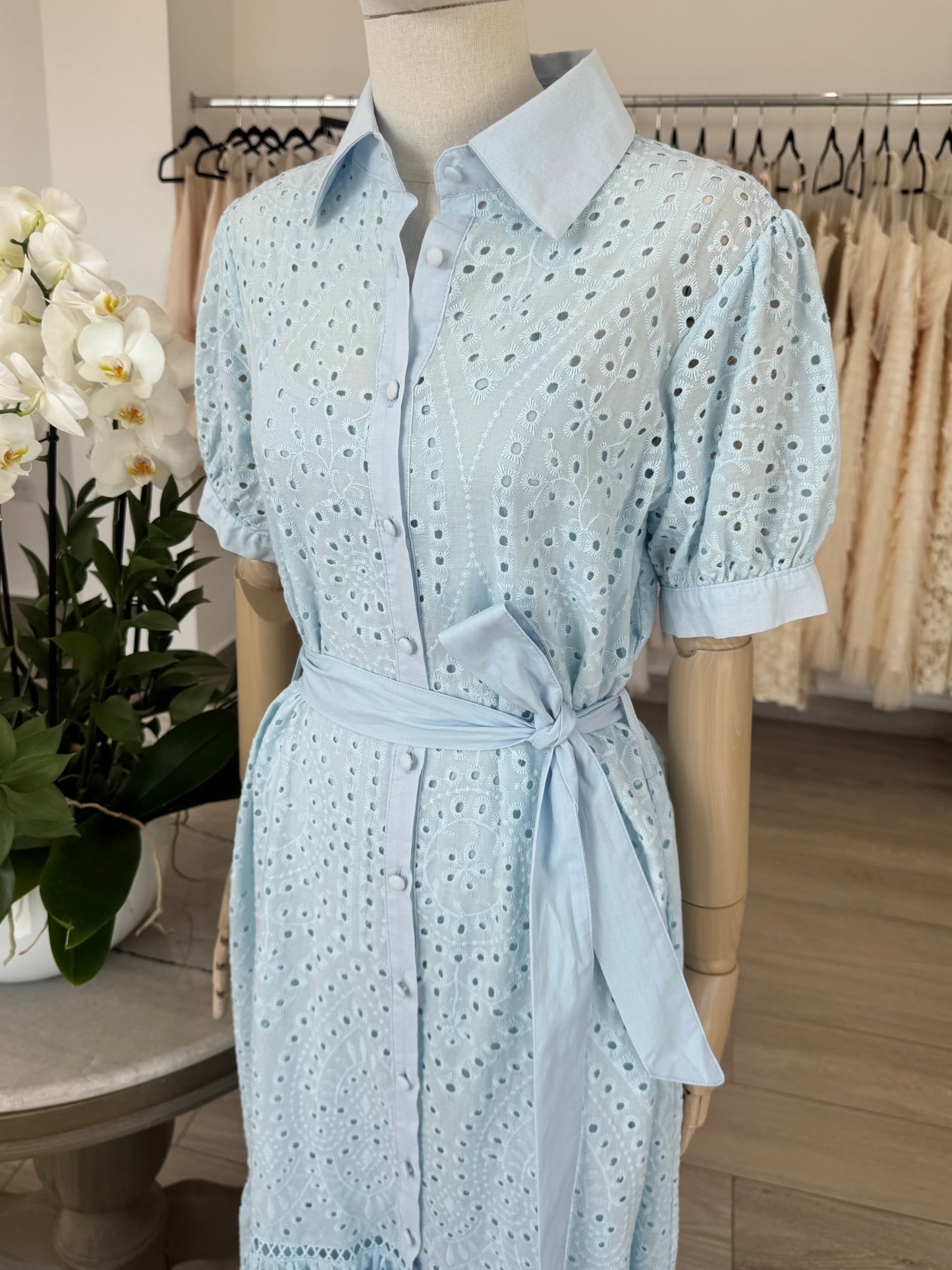 VESTIDO MIDI CAMISERO ALGODÓN BORDADO AZUL
