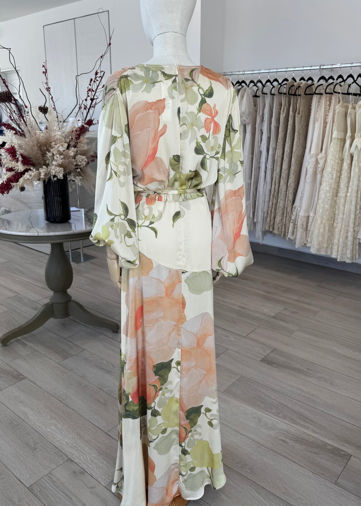 VESTIDO LARGO MANGA LARGA SATÍN FLORES CREMA