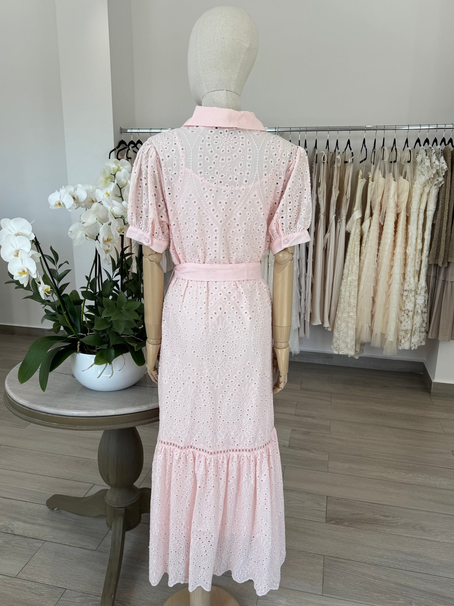 VESTIDO MIDI CAMISERO ALGODÓN BORDADO ROSA