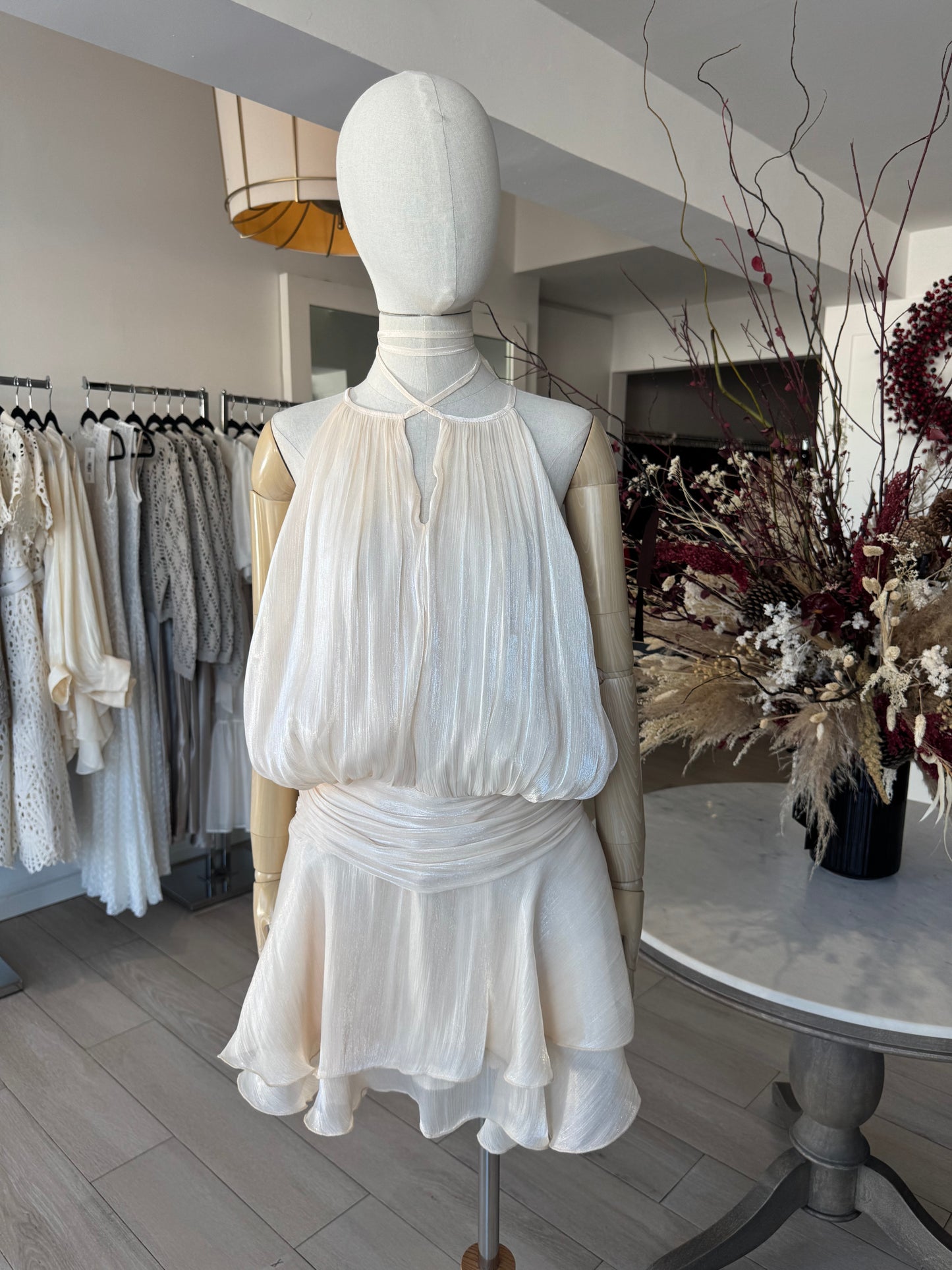 VESTIDO CORTO HALTER CINTURA BAJA CREMA