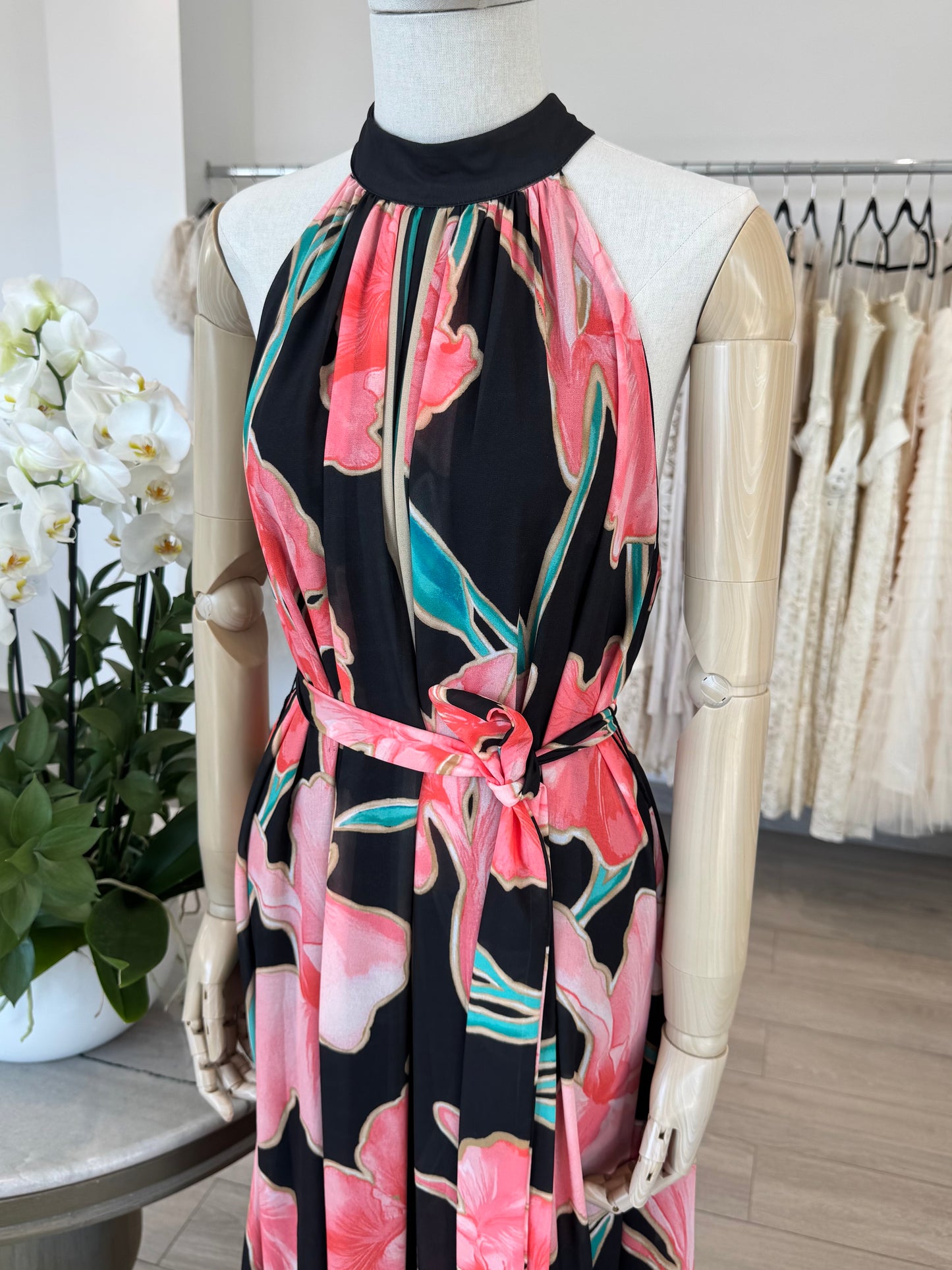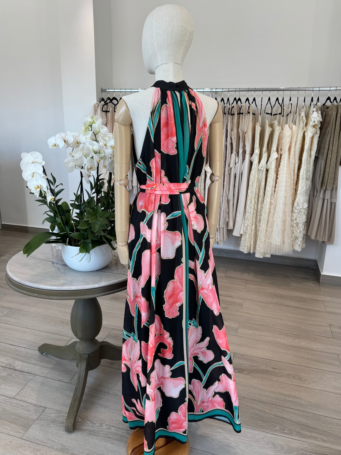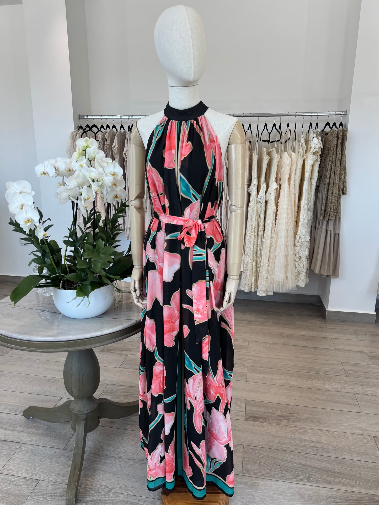 VESTIDO LARGO HALTER NEGRO FLORES ROSA