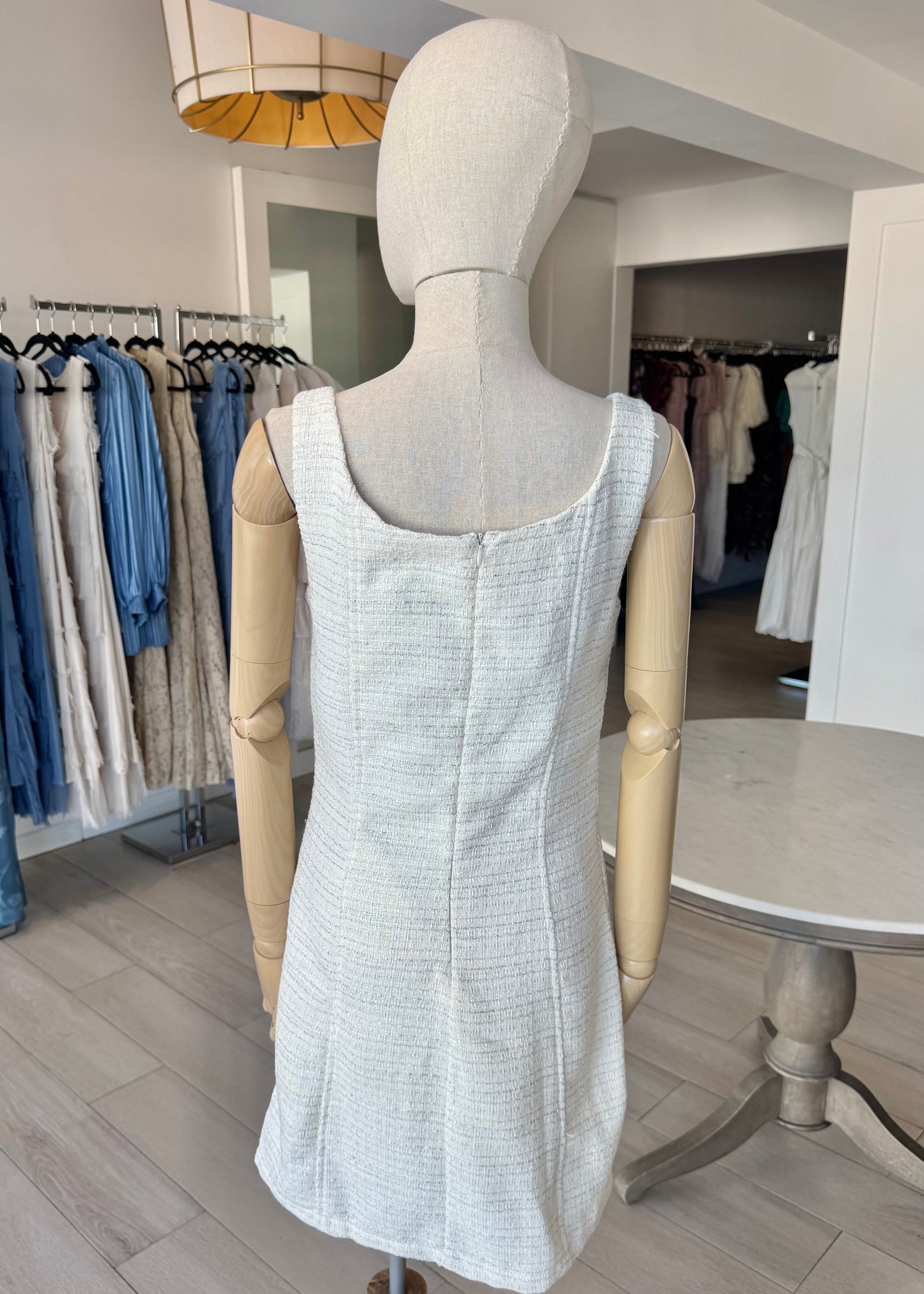 El tweed, el corte sin mangas y la flor protagonista crean un look sencillo pero con personalidad.¡Un vestido corto diferente!
