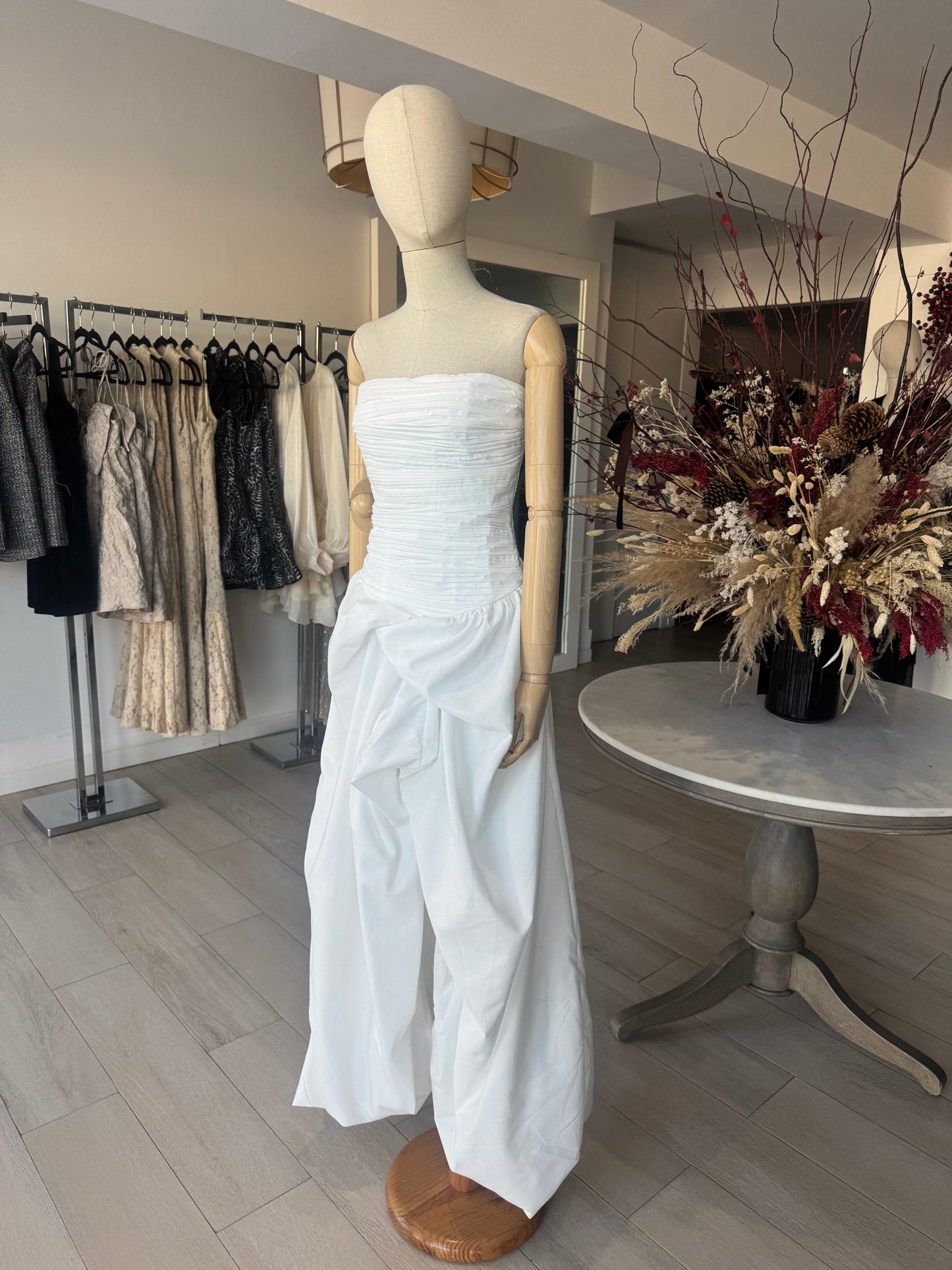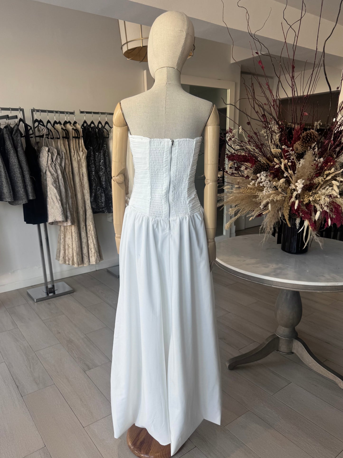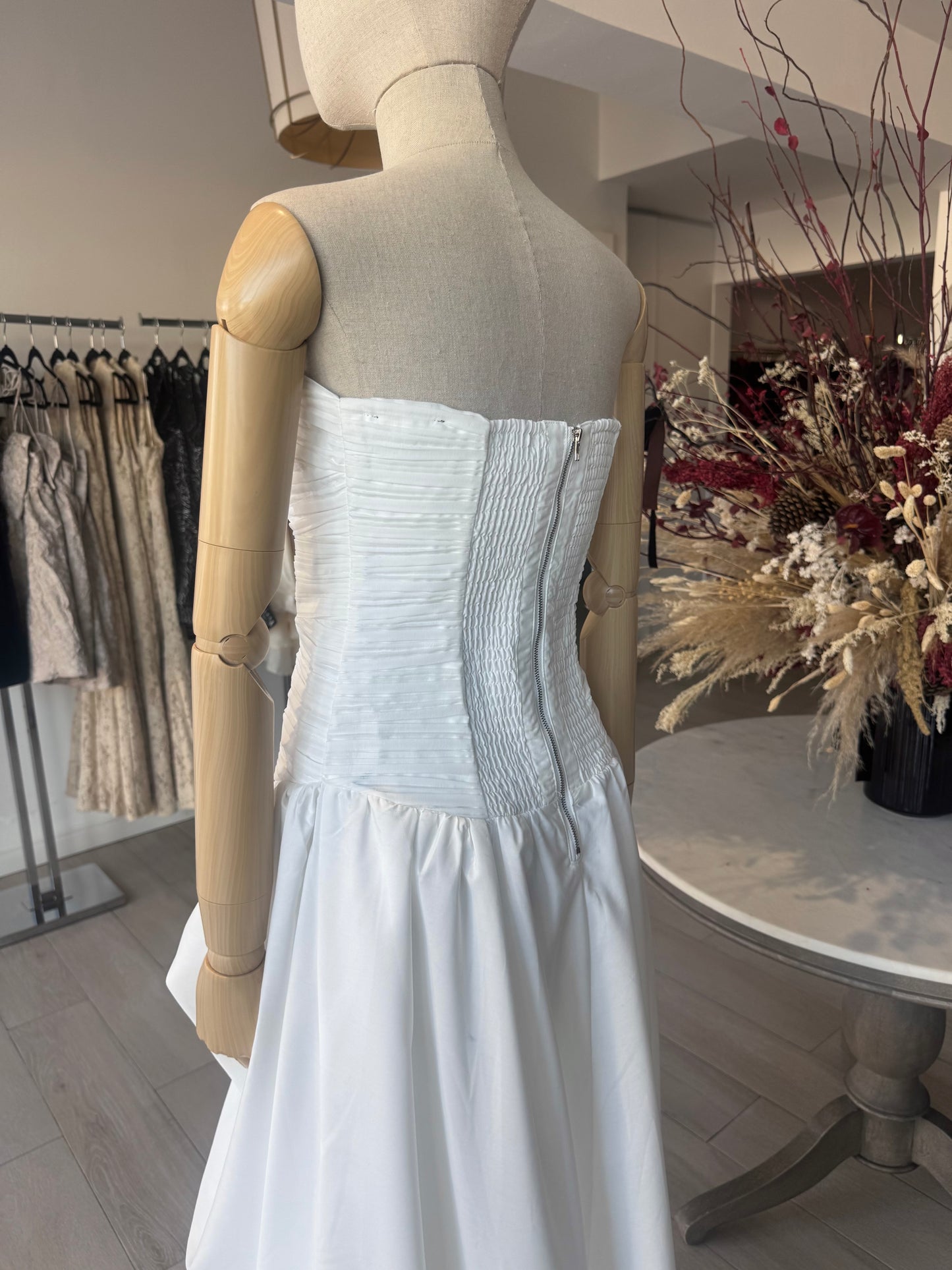 ¡Este modelo nos encanta! Ligero, con detalle strapless y corte asimétrico es ideal para un look arreglado para una ocasión especial.