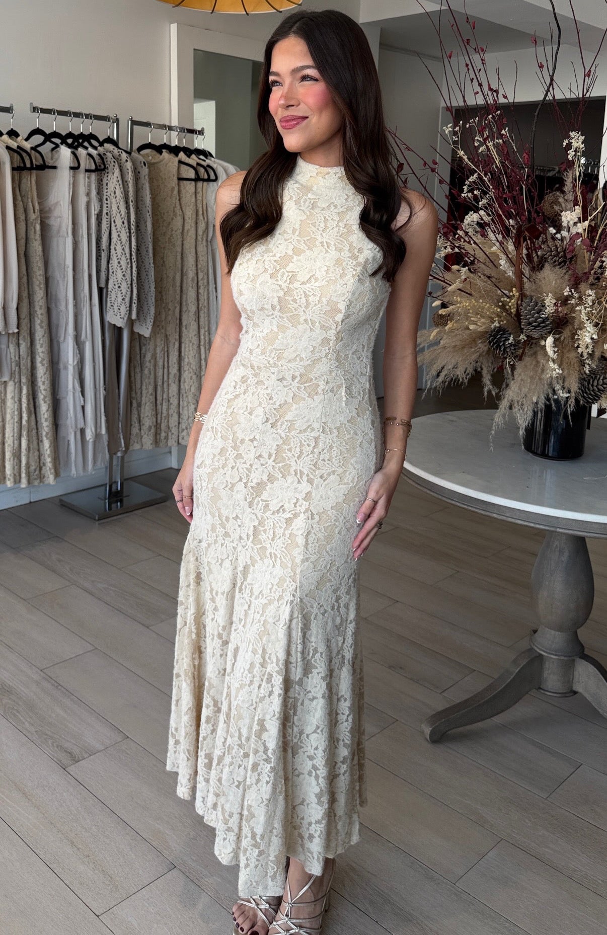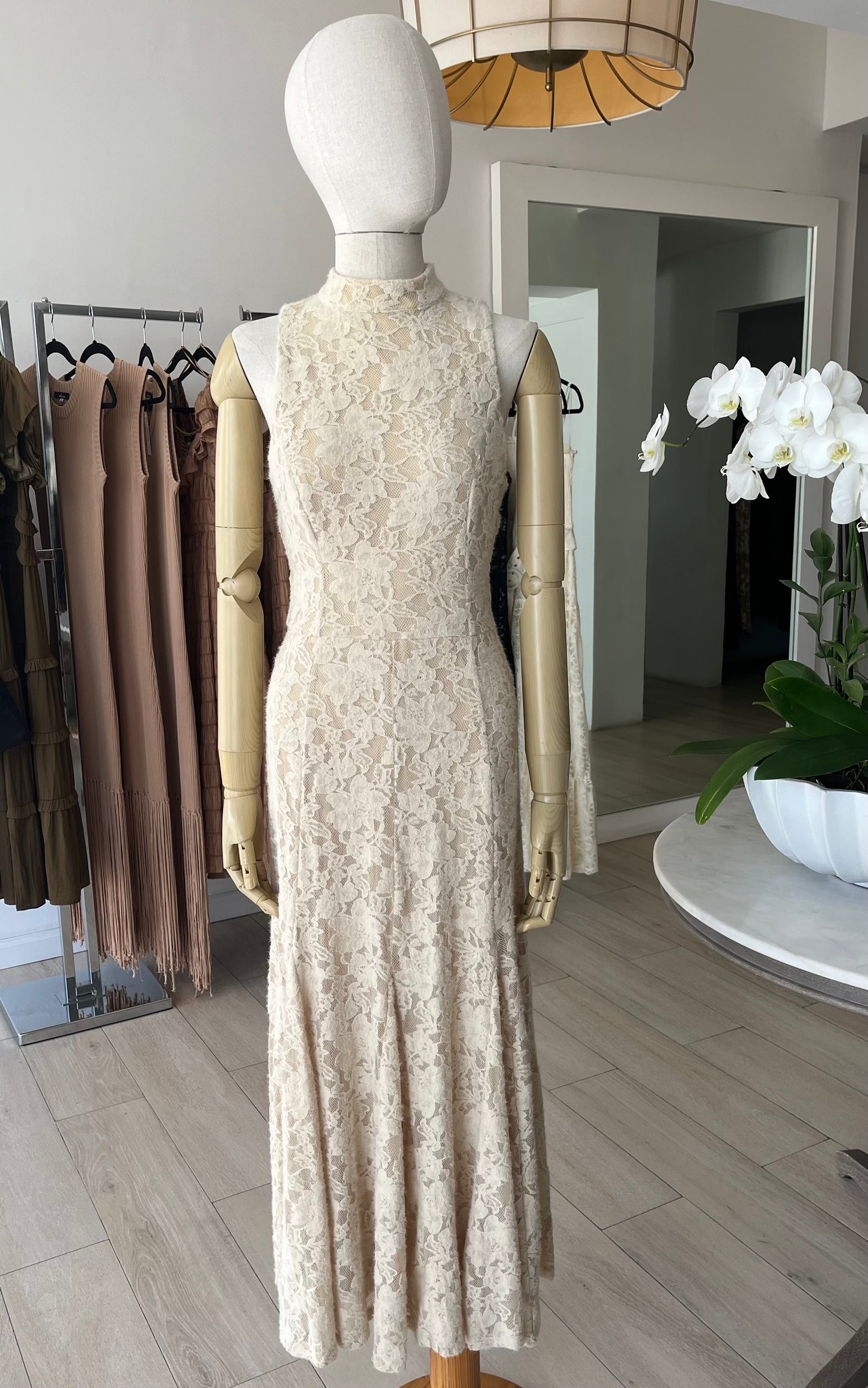 VESTIDO MIDI CUELLO ALTO ENCAJE BEIGE