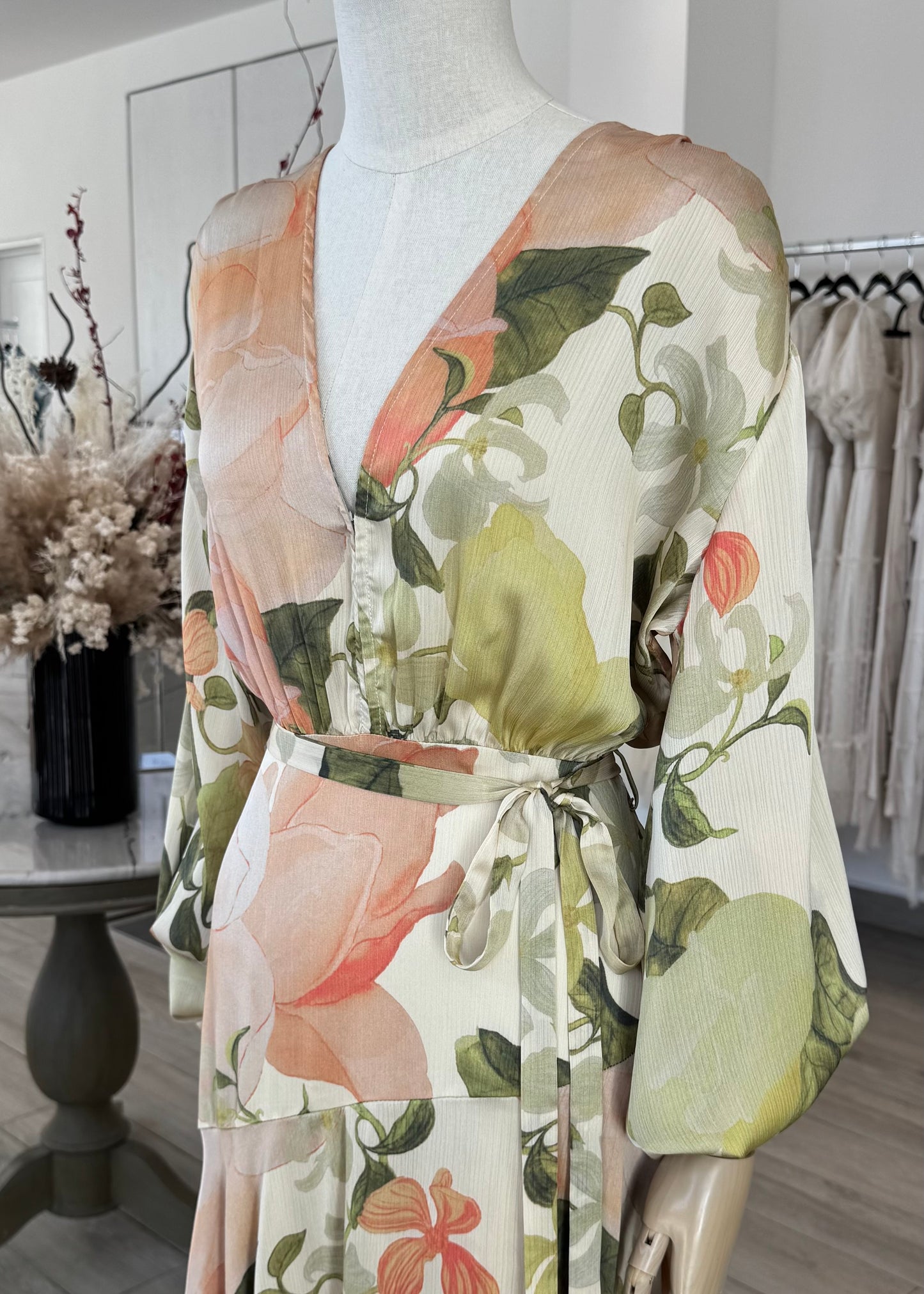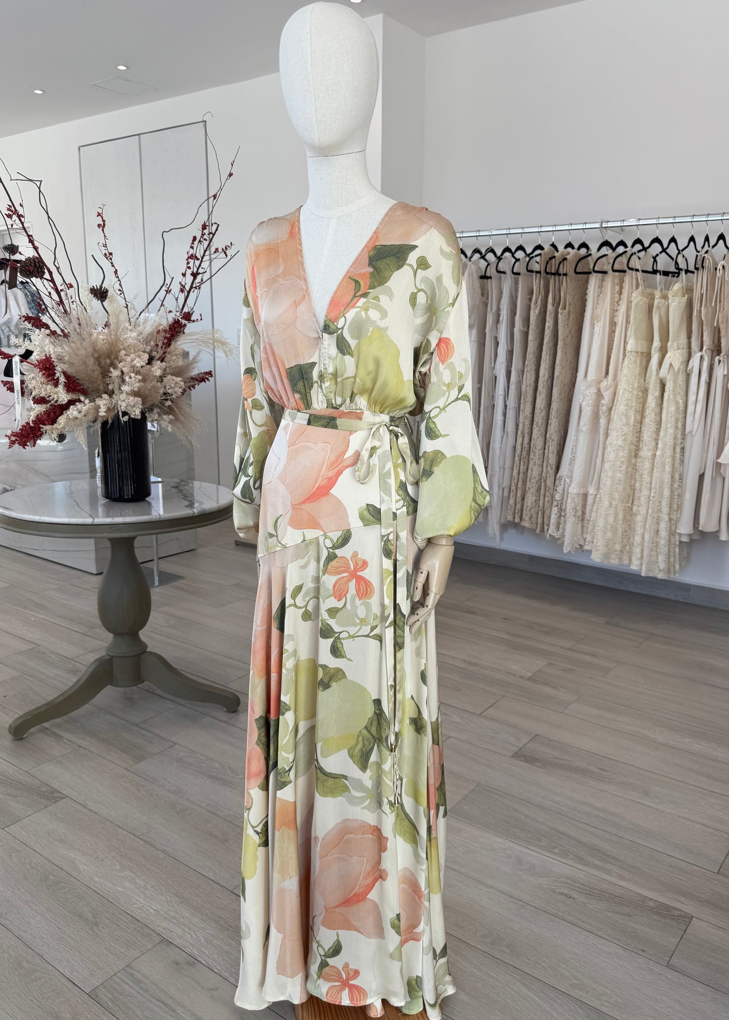 VESTIDO LARGO MANGA LARGA SATÍN FLORES CREMA