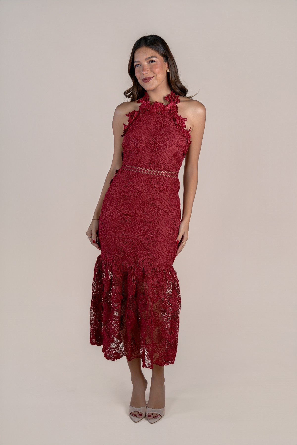 VESTIDO HALTER OLANES ENCAJE ROJO