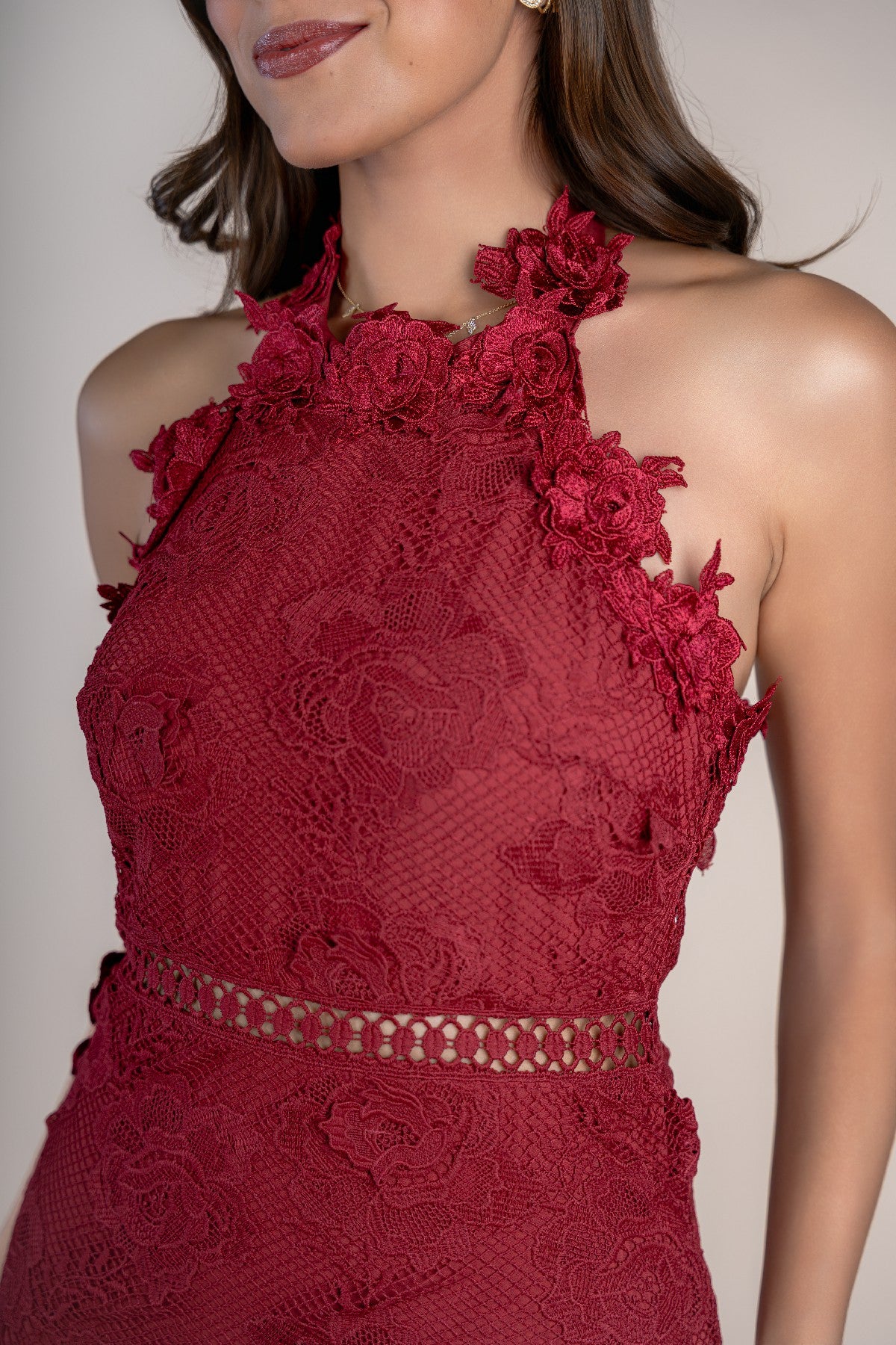 VESTIDO HALTER ENCAJE FLORES ROJO
