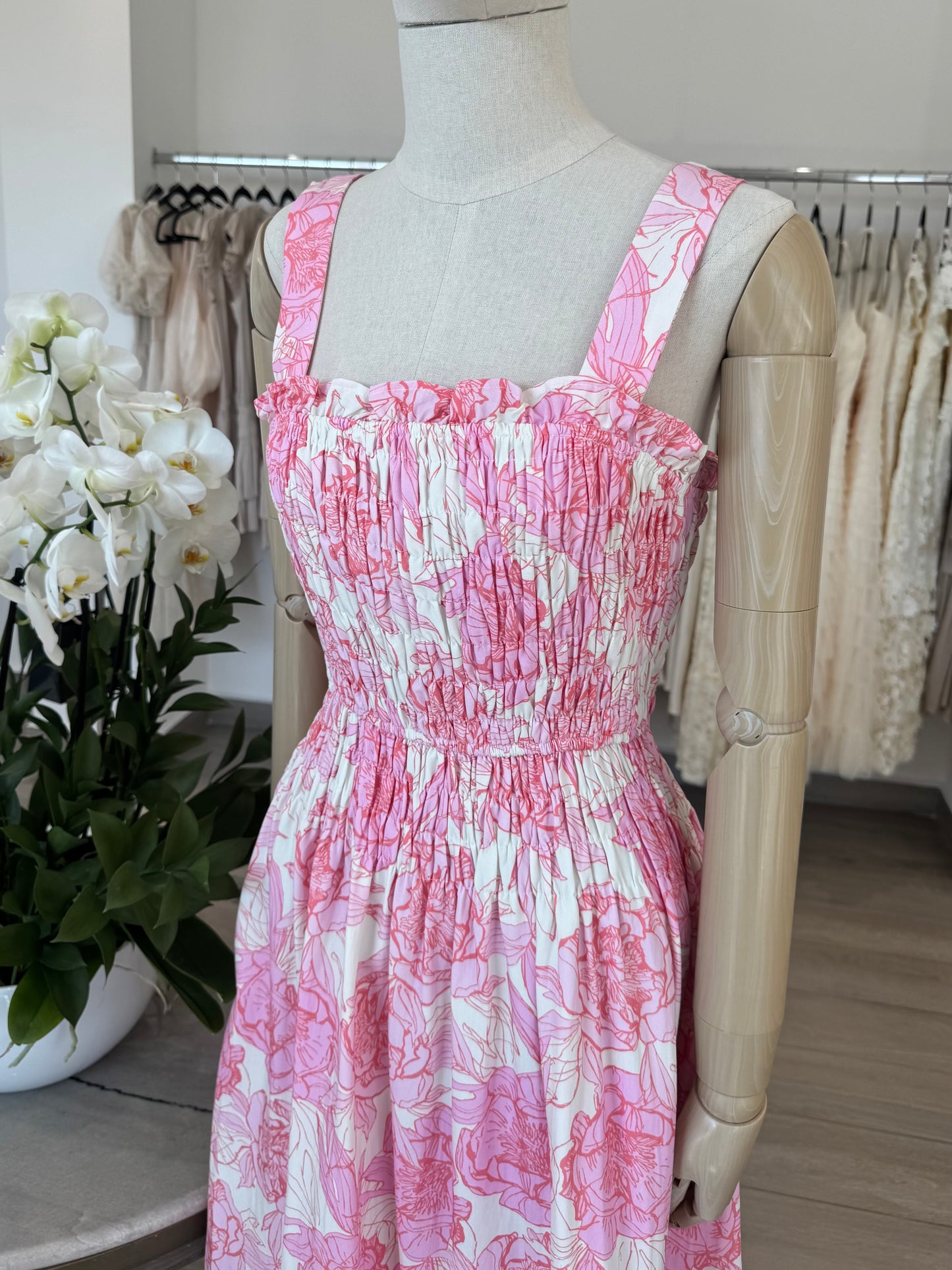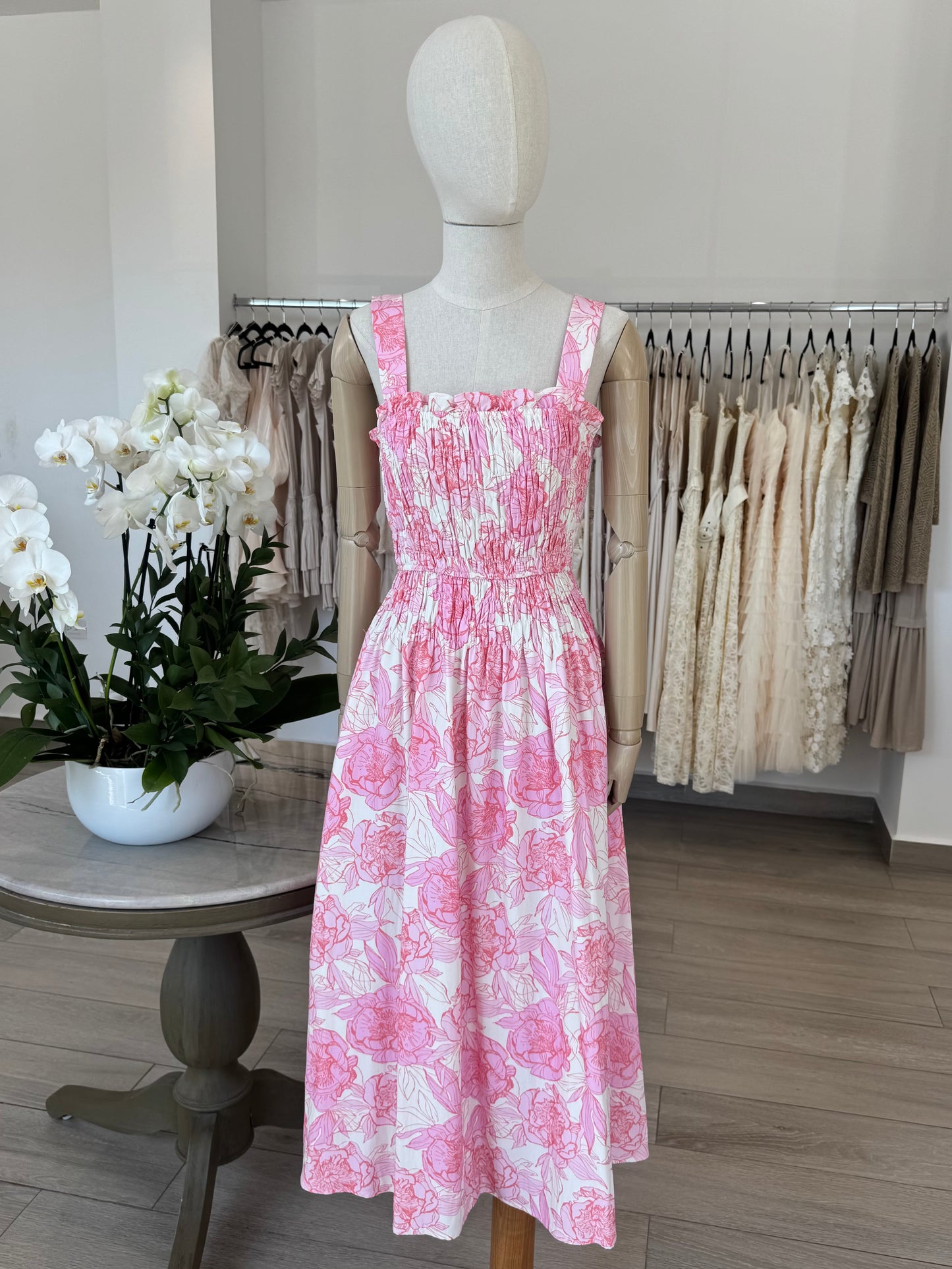 VESTIDO MIDI ELASTICO FLORES ROSA