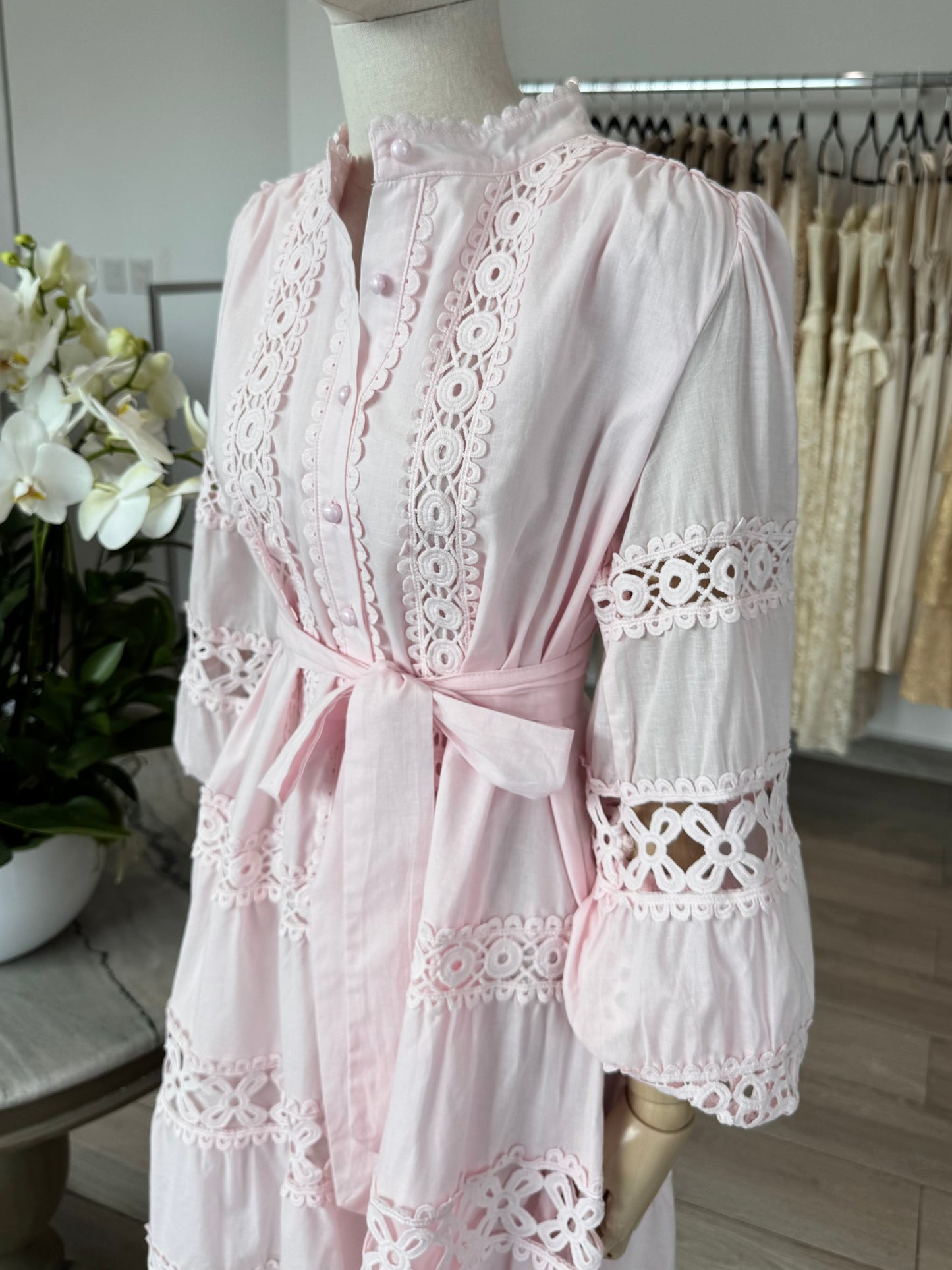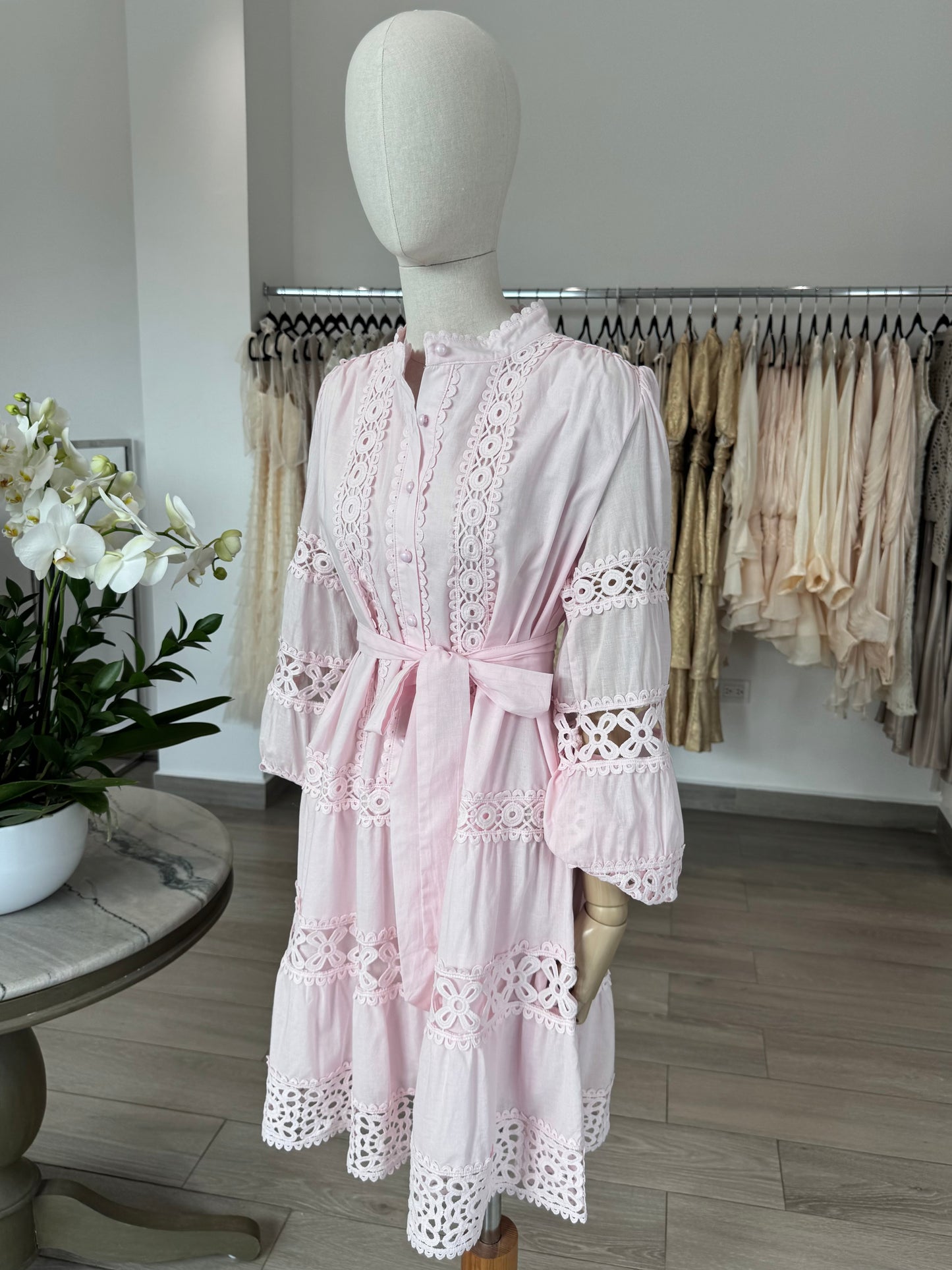 VESTIDO CORTO MAO MANGA LARGA ENCAJE ROSA