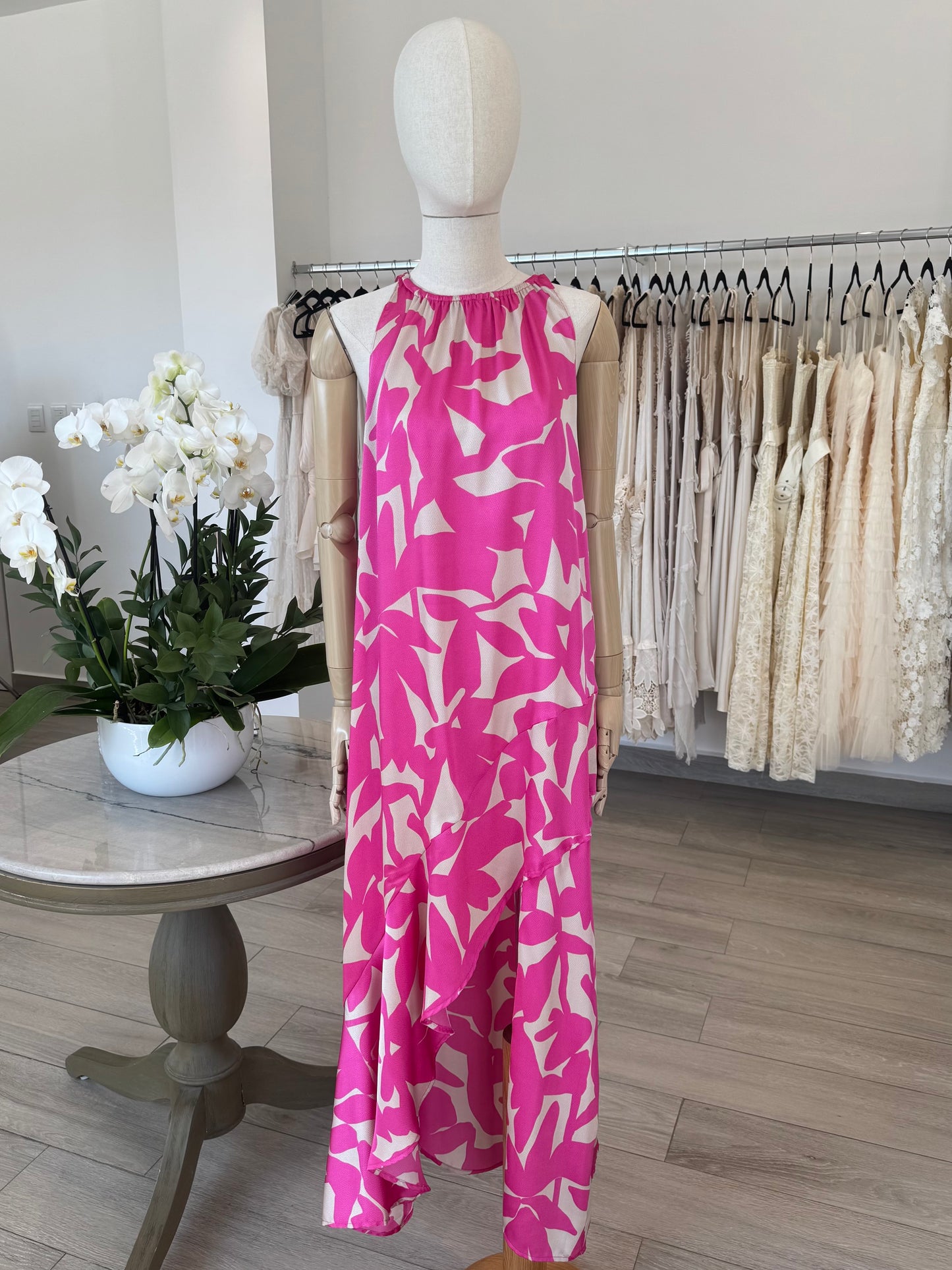 VESTIDO ASIMÉTRICO FLORES FUCSIA