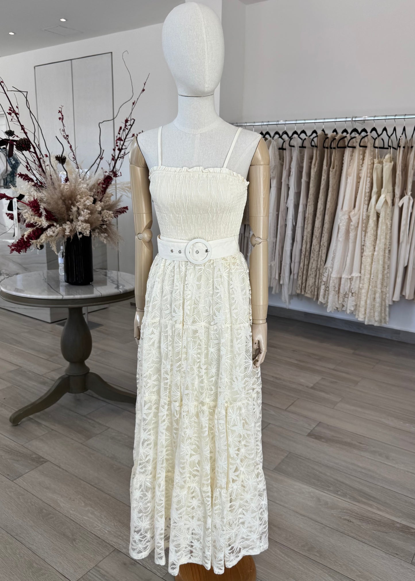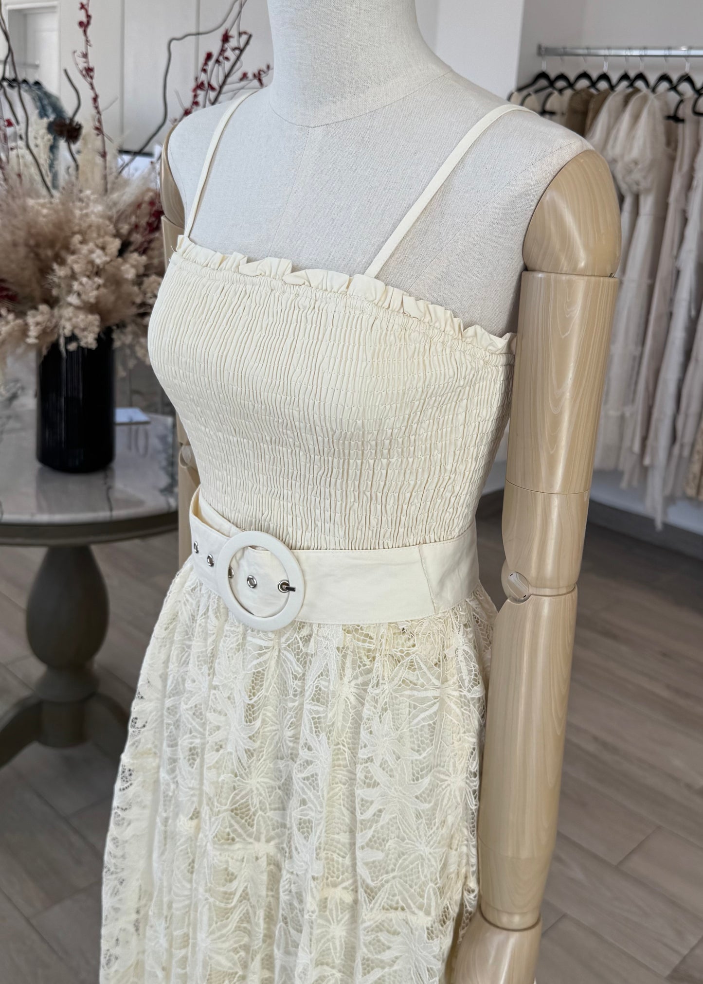 VESTIDO MIDI ELASTICO CINTURON ENCAJE CREMA