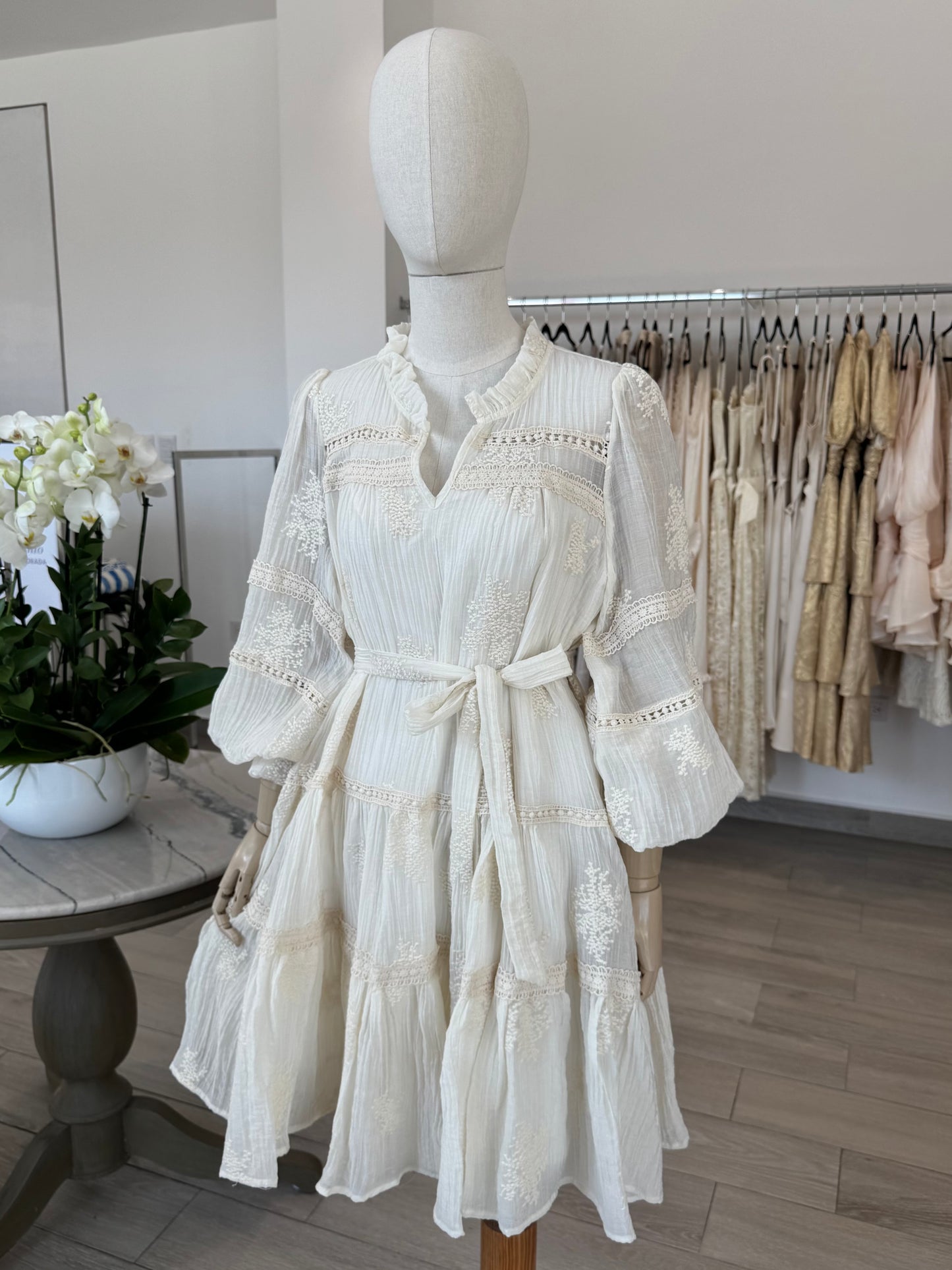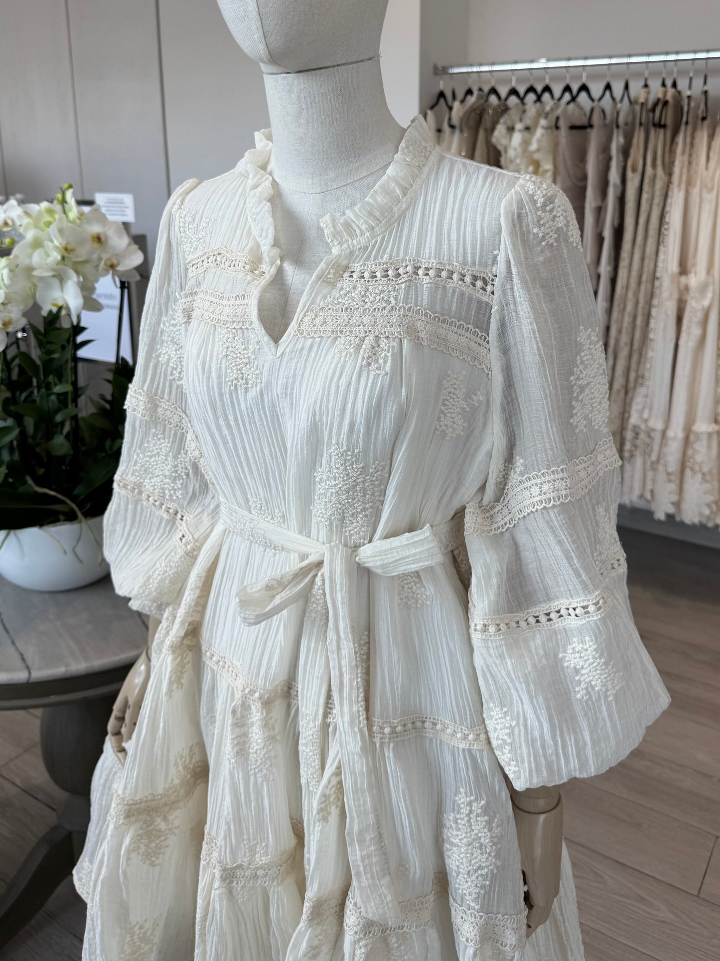 VESTIDO CORTO MANGA LARGA ENCAJE CRUDO