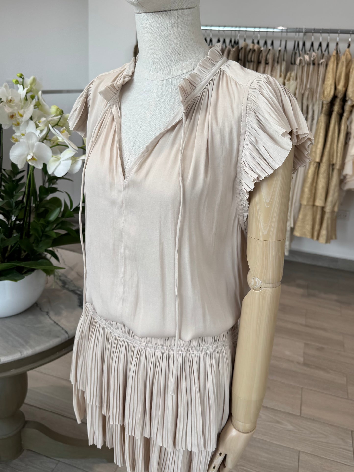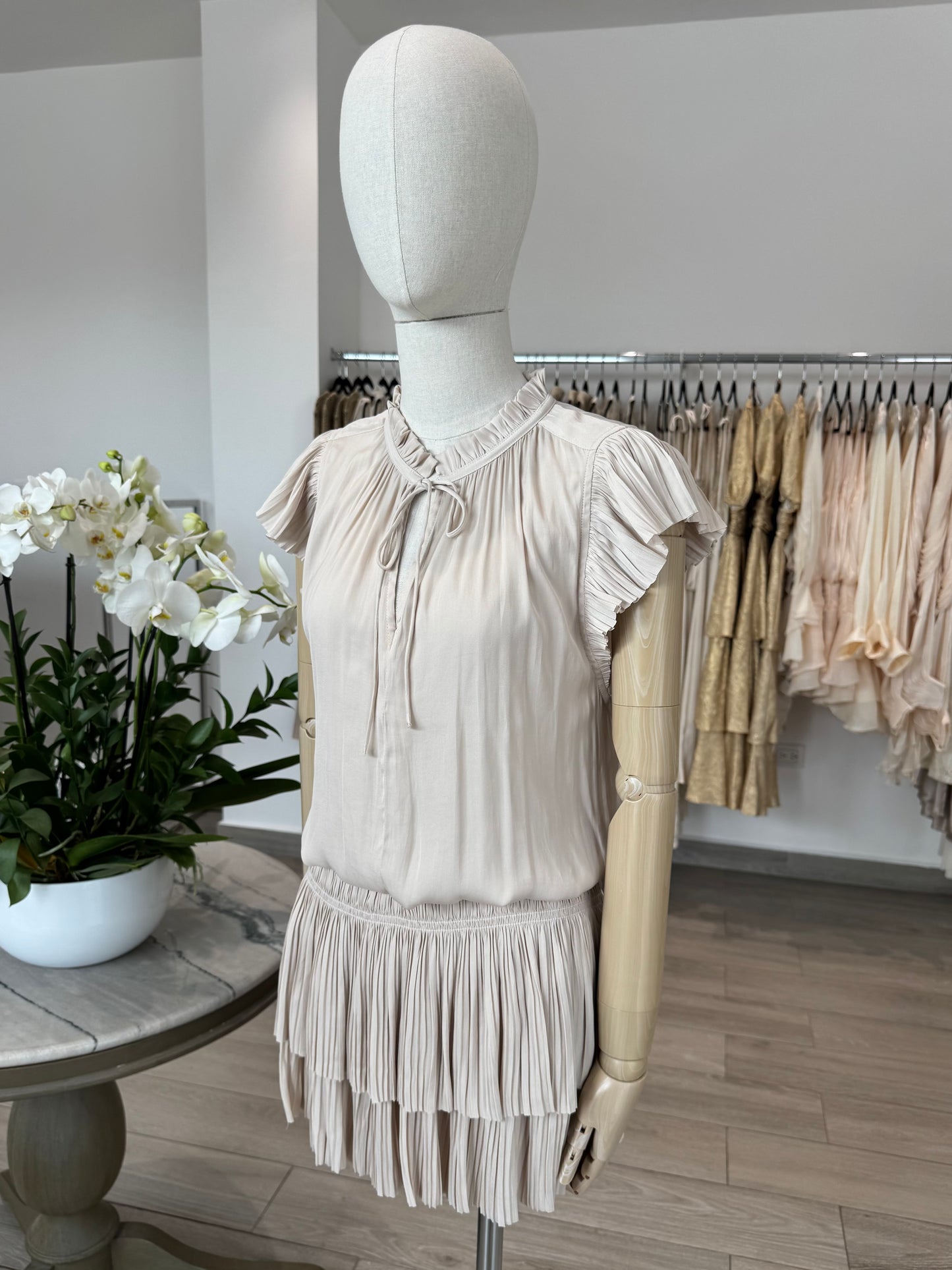 VESTIDO CORTO CINTURA ELÁSTICA SEDA BEIGE