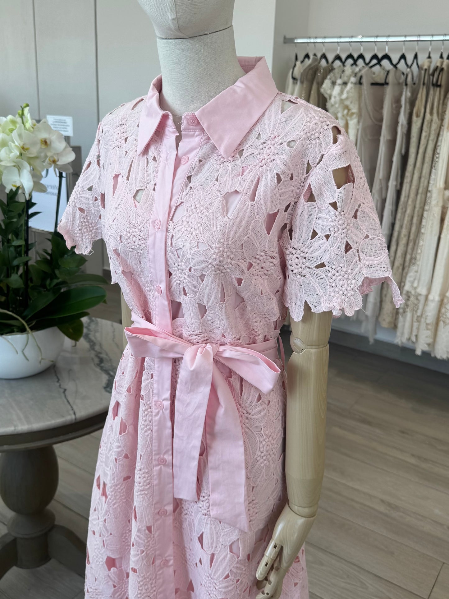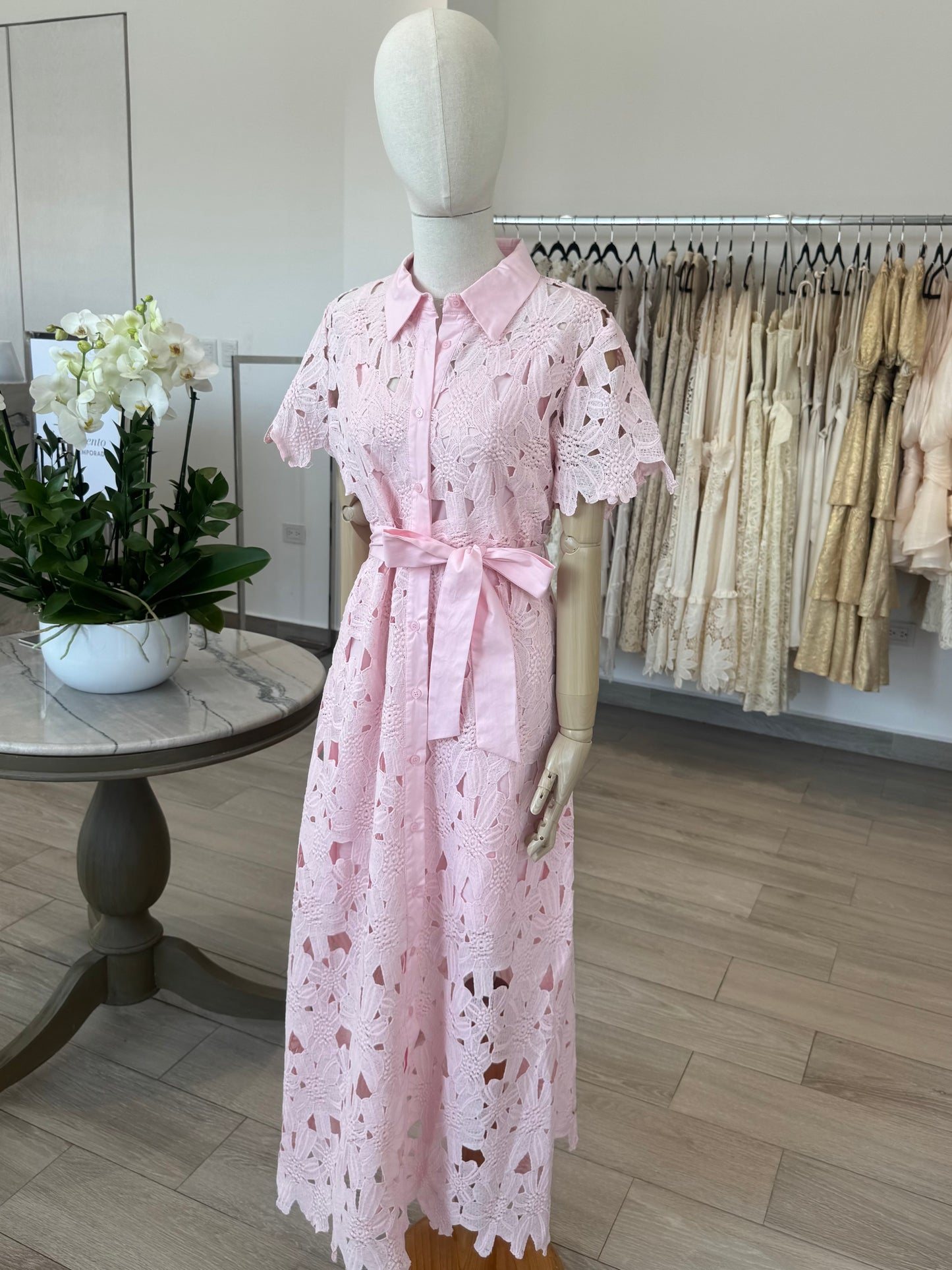 VESTIDO MIDI CAMISERO ENCAJE ROSA