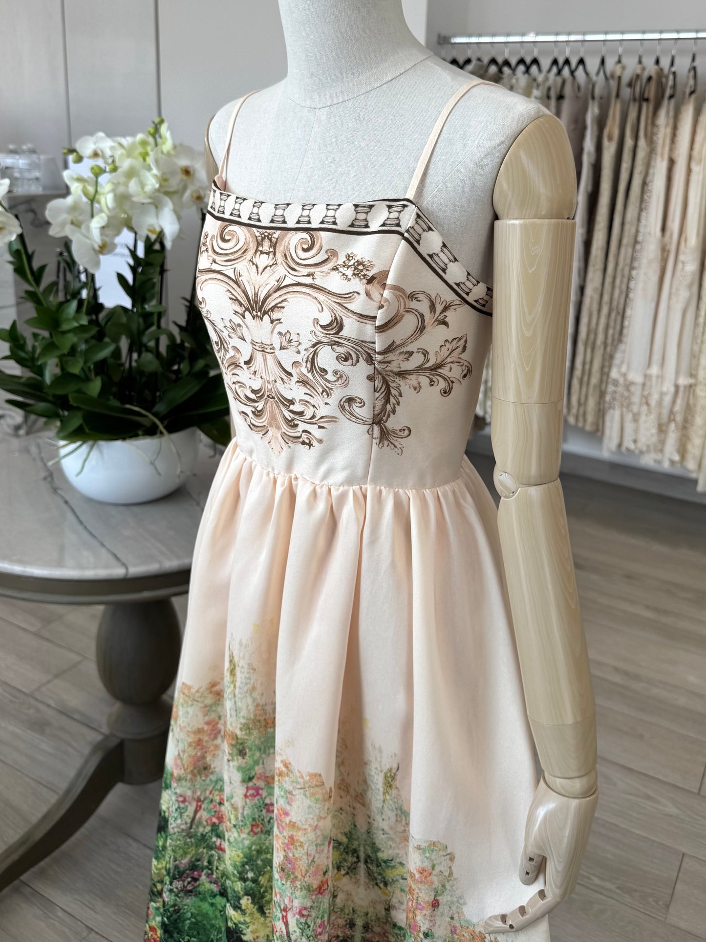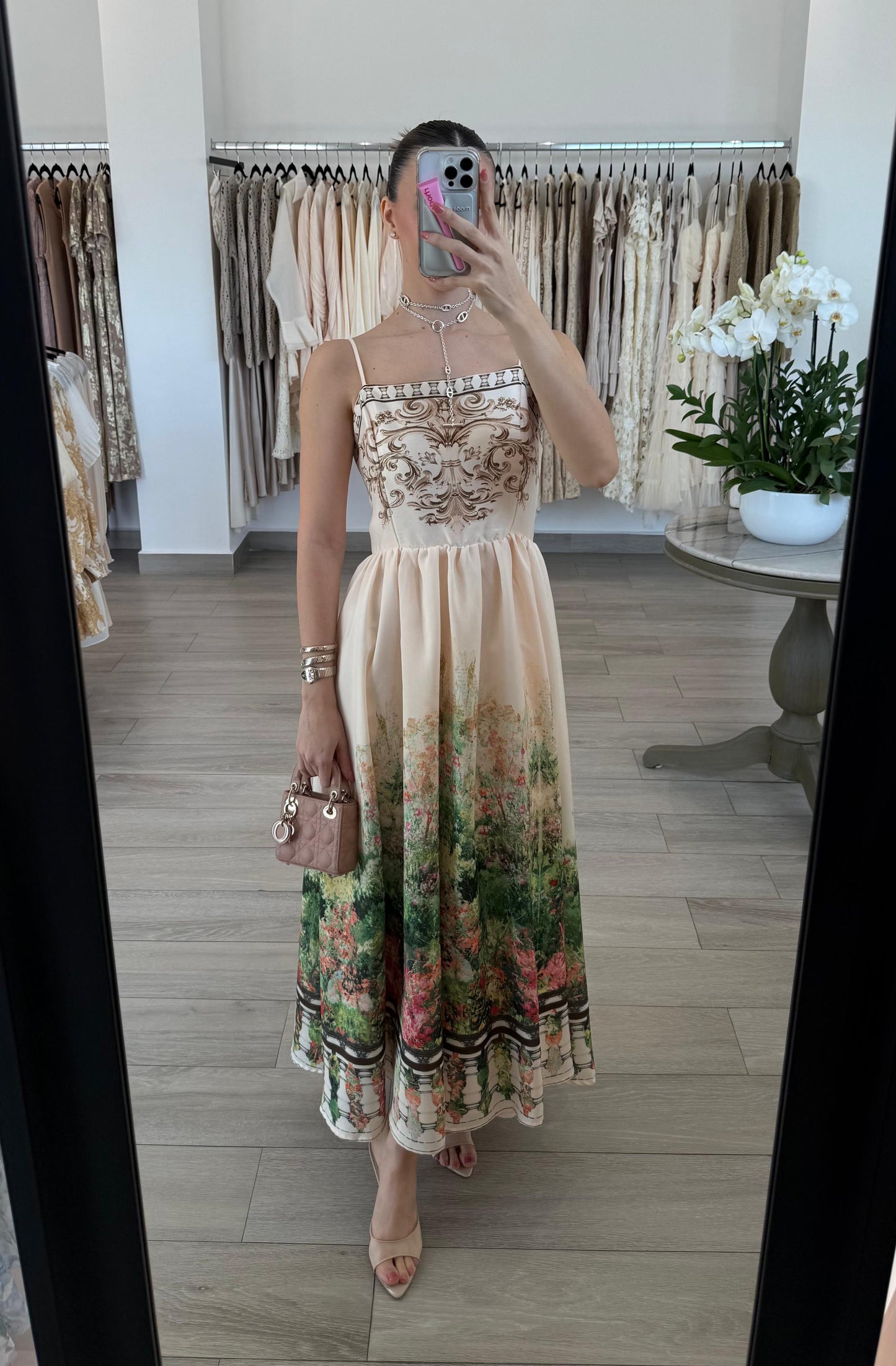 VESTIDO MIDI ESTAMPADO JARDÍN BEIGE