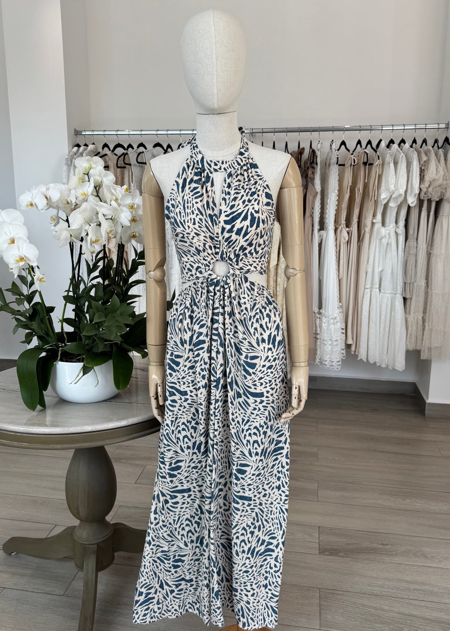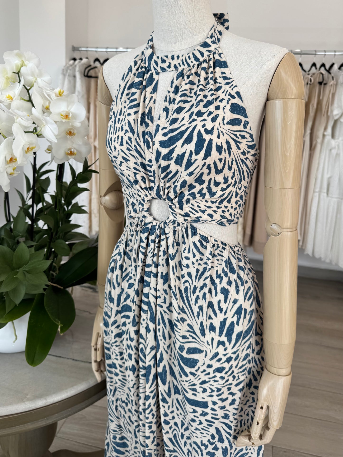 VESTIDO MIDI HALTER CUT OUT ESTAMPADO AZUL / BLANCO
