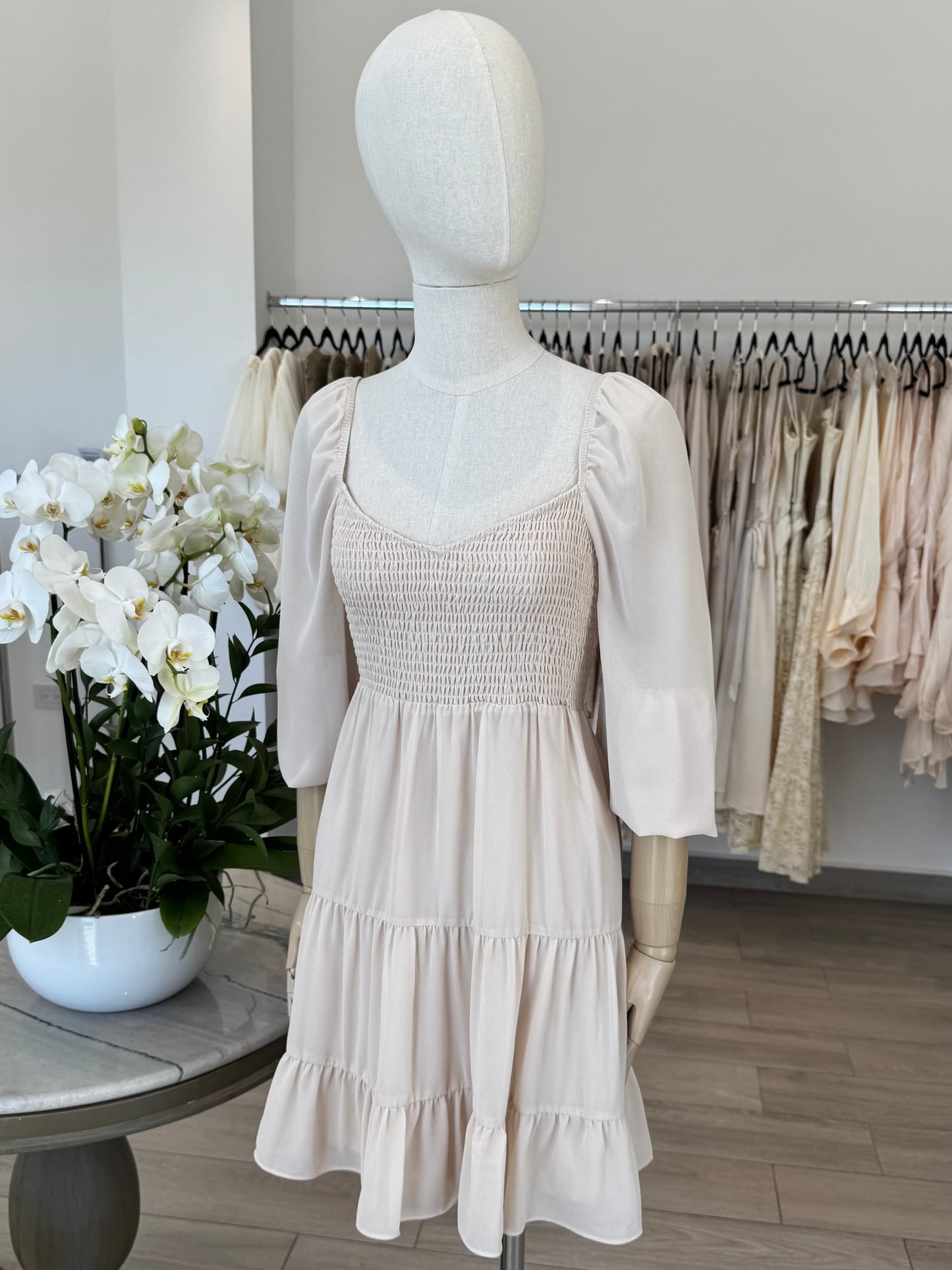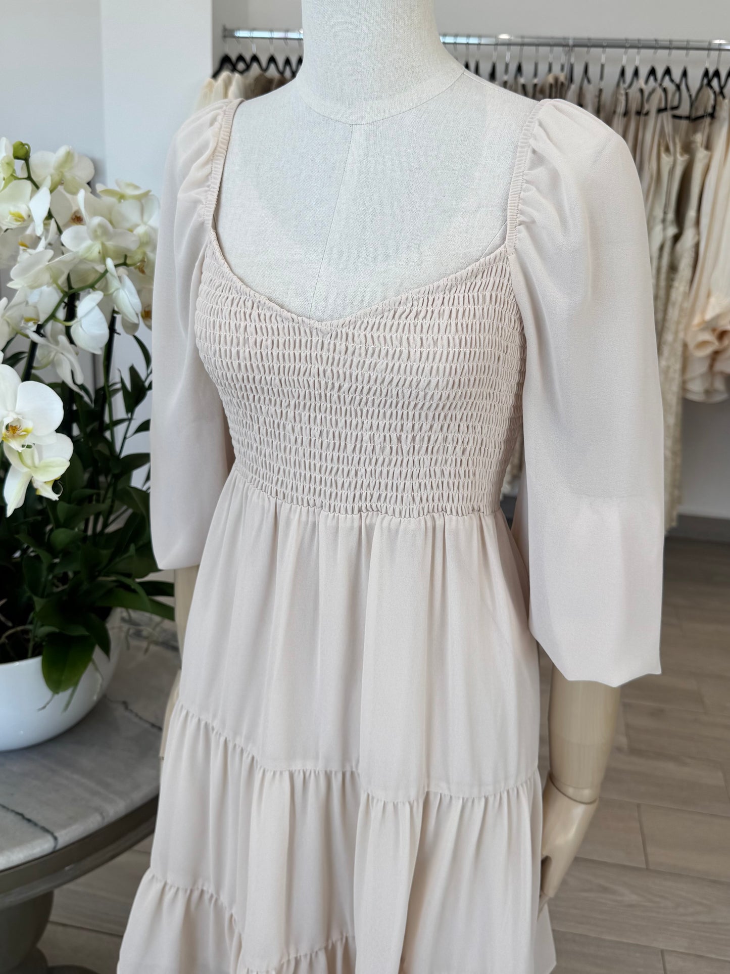 VESTIDO CORTO CINTURA ELÁSTICA SEDA BEIGE