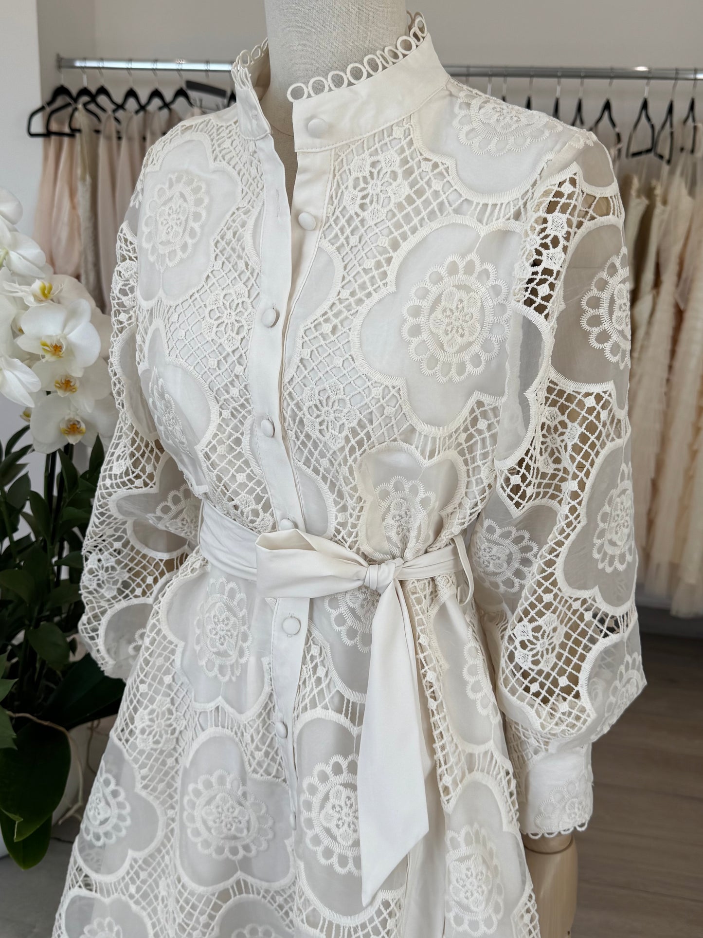 VESTIDO CORTO MAO MANGA LARGA ENCAJE CRUDO