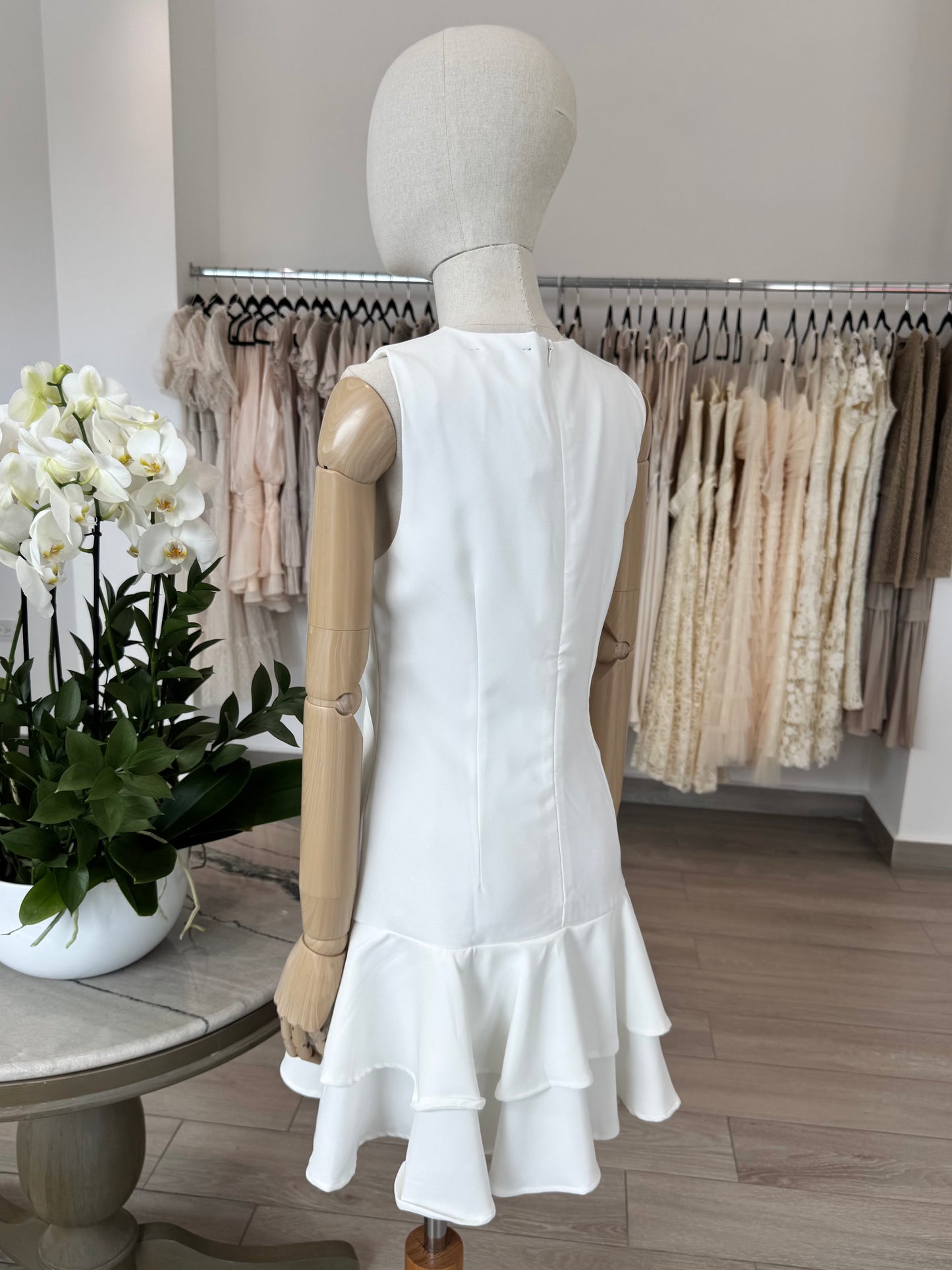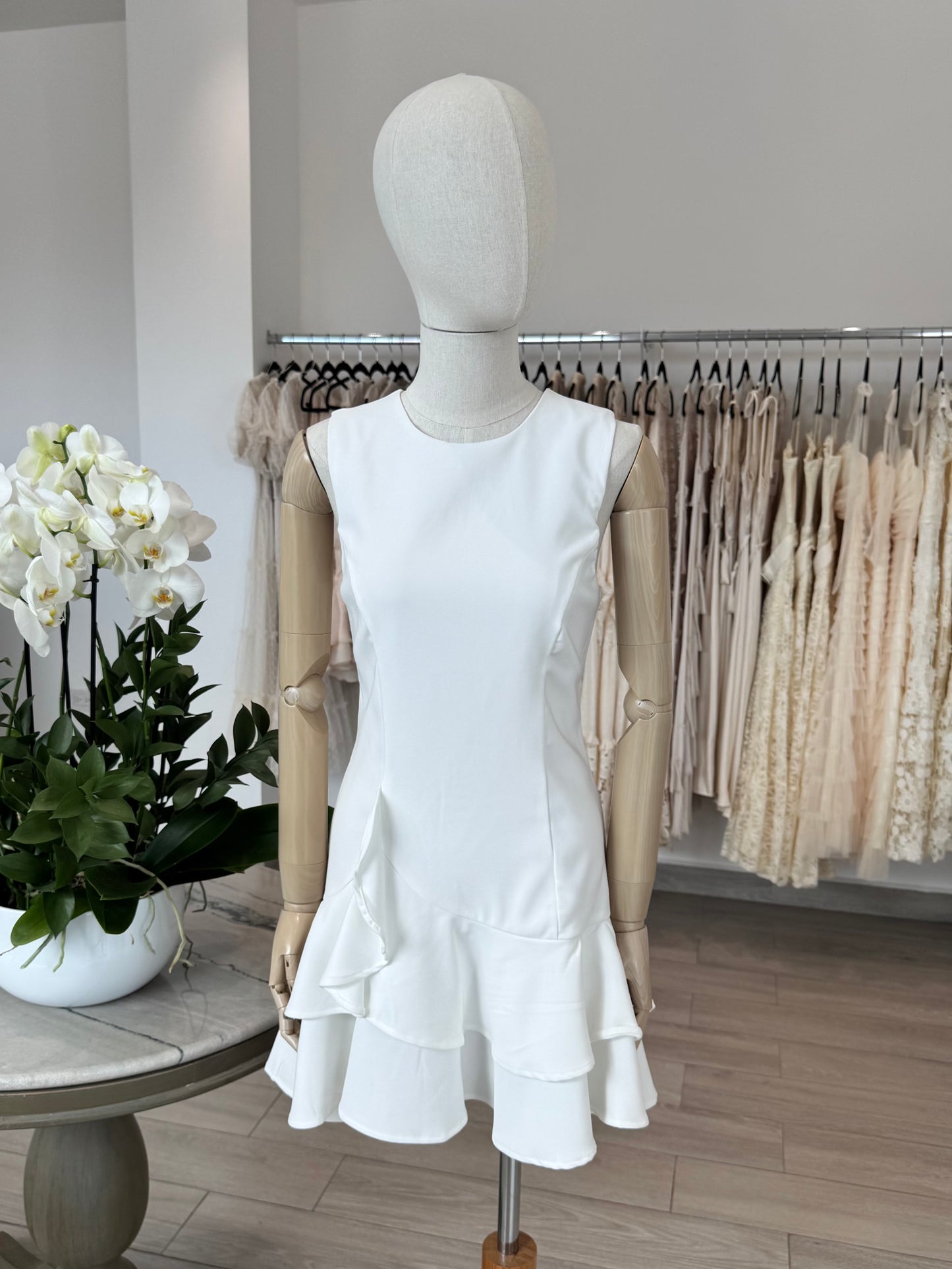VESTIDO CORTO FALDA OLANES BLANCO