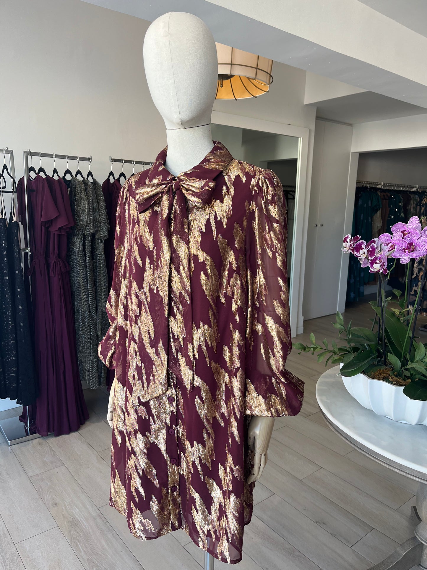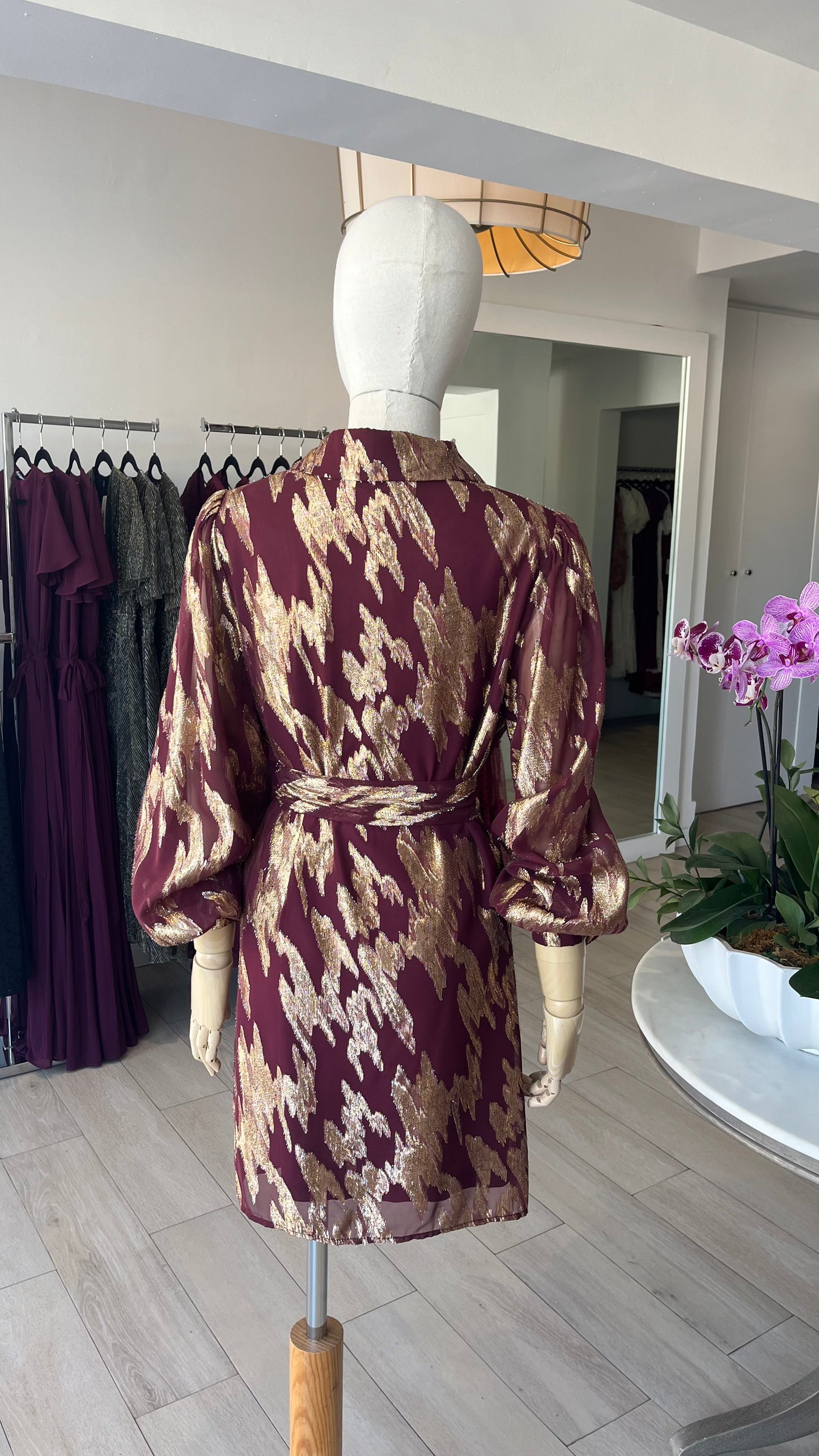 VESTIDO CORTO CAMISERO VINO / DORADO
