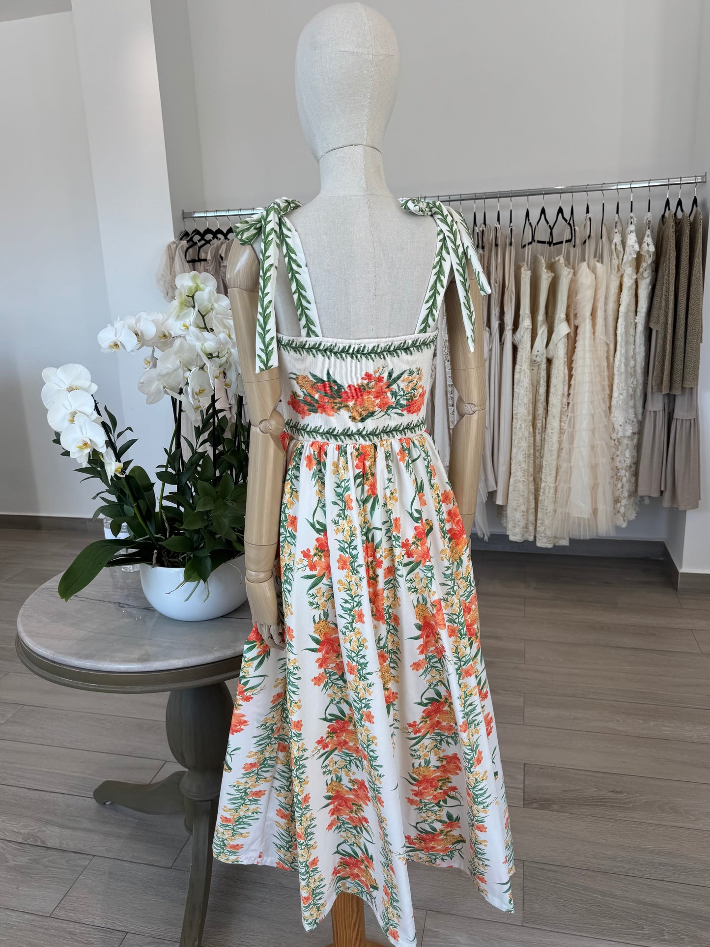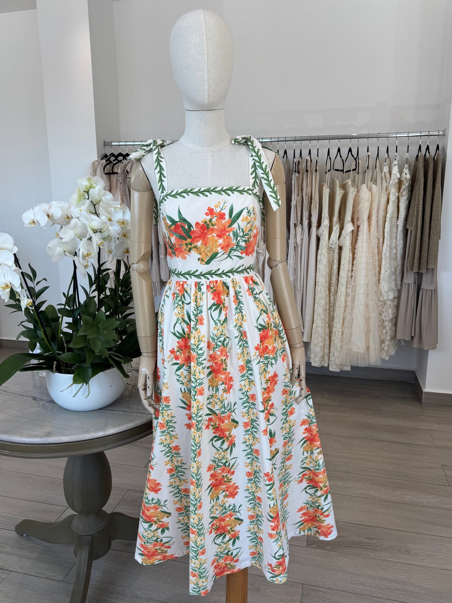 VESTIDO MIDI TIRANTES FLORES NARANJA / VERDE
